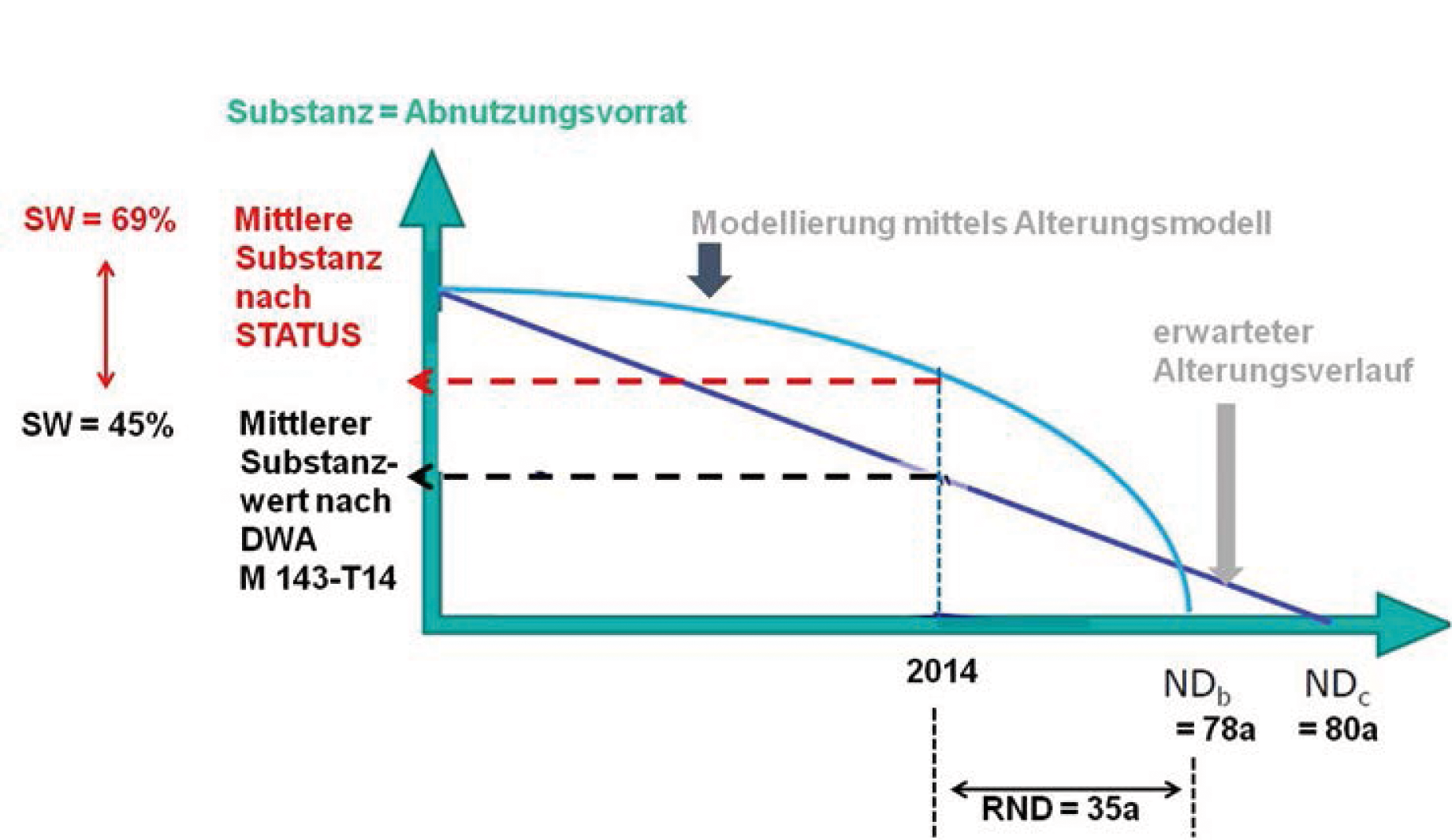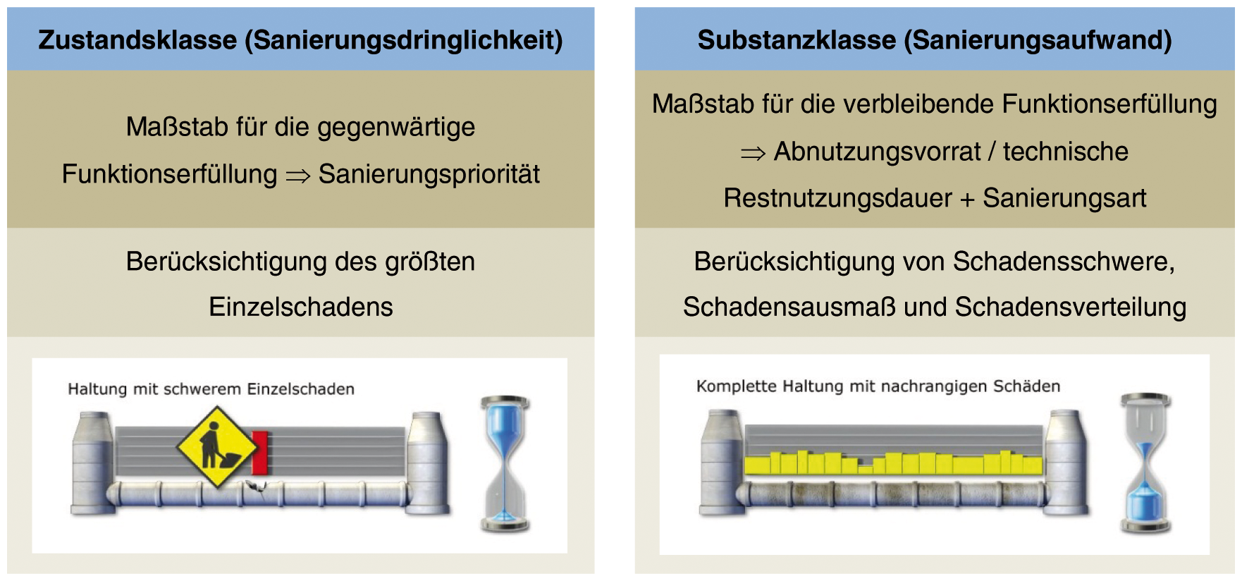 Die Substanz(klasse) als Maß der noch innewohnenden Funktionserfüllung (Abnutzungsvorrat) ist ein maßgebliches Kriterium für die Abschätzung der Restnutzungsdauer des Objektes. Darüber hinaus hilft sie bei der Beantwortung der Frage, welche Sanierungsmaßnahme notwendig ist, d. h. wie ökonomisch sinnvoll eine Reparatur, Renovierung oder Erneuerung im Hinblick auf die noch zu erwartende Restnutzungsdauer des untersuchten Objektes ist (Abbildung 2 und Abbildung 3). Die Substanz stellt somit den Abnutzungsvorrat eines Kanalnetzes oder einer Haltung unter der Berücksichtigung des Alters und ggf. vorhandener Mängel dar, welcher in DIN 31051 [14] als „Vorrat der möglichen Funktionserfüllungen unter festgelegten Bedingungen, der einem Objekt aufgrund der Herstellung und Instandhaltung innewohnt“, beschrieben ist.