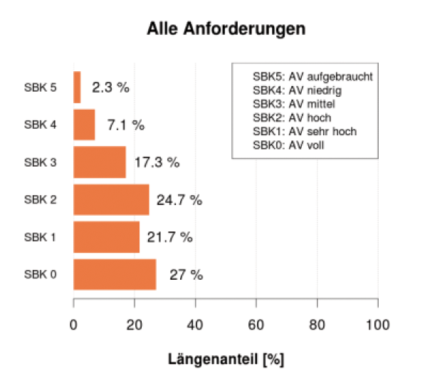 Die Substanzklasse eines Objektes wird für jedes der Schutzziele (Standsicherheit, Betriebssicherheit und Dichtheit) zum Zeitpunkt der Inspektion ermittelt. Bei der Darstellung „Alle Anforderungen“ sind alle drei Schutzziele einbezogen und jeweils der auf Haltungsebene kritischste Gefährdungsaspekt erfasst. Die Substanzklassenverteilung der Haltungen ist in Abbildung 4 dargestellt.