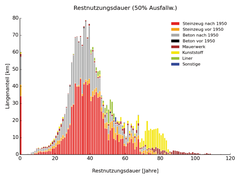 Die Ermittlung der Restnutzungsdauer (Restnutzungsdaueranalyse) erfolgte individuell für jede Haltung durch Prognose der Zustands- und Substanzentwicklung bis zum Ende des Prognosezeitraumes bzw. bis zu dem Zeitpunkt, ab dem das Objekt erneuerungsbedürftig ist, d. h. die Ausfallwahrscheinlichkeit der gegenständlichen Haltung einen bestimmten Grenzwert erreicht hat. Grundlage für diese Prognose bildete die Annahme einer ungestörten Netzalterung, d. h. es erfolgt keine Intervention durch Sanierungsmaßnahmen. Diese Annahme ist in analytischer Hinsicht von großer Bedeutung, da nur so die Geschwindigkeit des netzspezifischen Alterungsprozesses anschaulich beschrieben werden kann. Der Zeitraum bis zum weitgehenden Verbrauch des Abnutzungsvorrates der Haltung (Substanzklasse 5) stellt die objektspezifische, individuelle Restnutzungsdauer dar. Mit der Restnutzungsdauer ist dabei nicht die maximale erreichbare Nutzungsdauer, sondern die verbleibende betriebsgewöhnliche Nutzungsdauer gemeint, nach deren Ablauf die Haltungen zur Vermeidung überdurchschnittlich hoher Ausfallrisiken in aller Regel saniert werden müssen. Abbildung 5 zeigt das Ergebnis einer solchen Restnutzungsdaueranalyse. Hier sind alle Haltungen (differenziert nach Werkstoffen) aufgeführt, bei denen die Ausfallwahrscheinlichkeit den Grenzwert von 50 % überschreitet. Während kurzfristig nur wenige Haltungen das Ende ihrer Restnutzungsdauer erreichen, steigt die Länge erneuerungsbedürftiger Haltungen in den nächsten Jahrzehnten deutlich an.