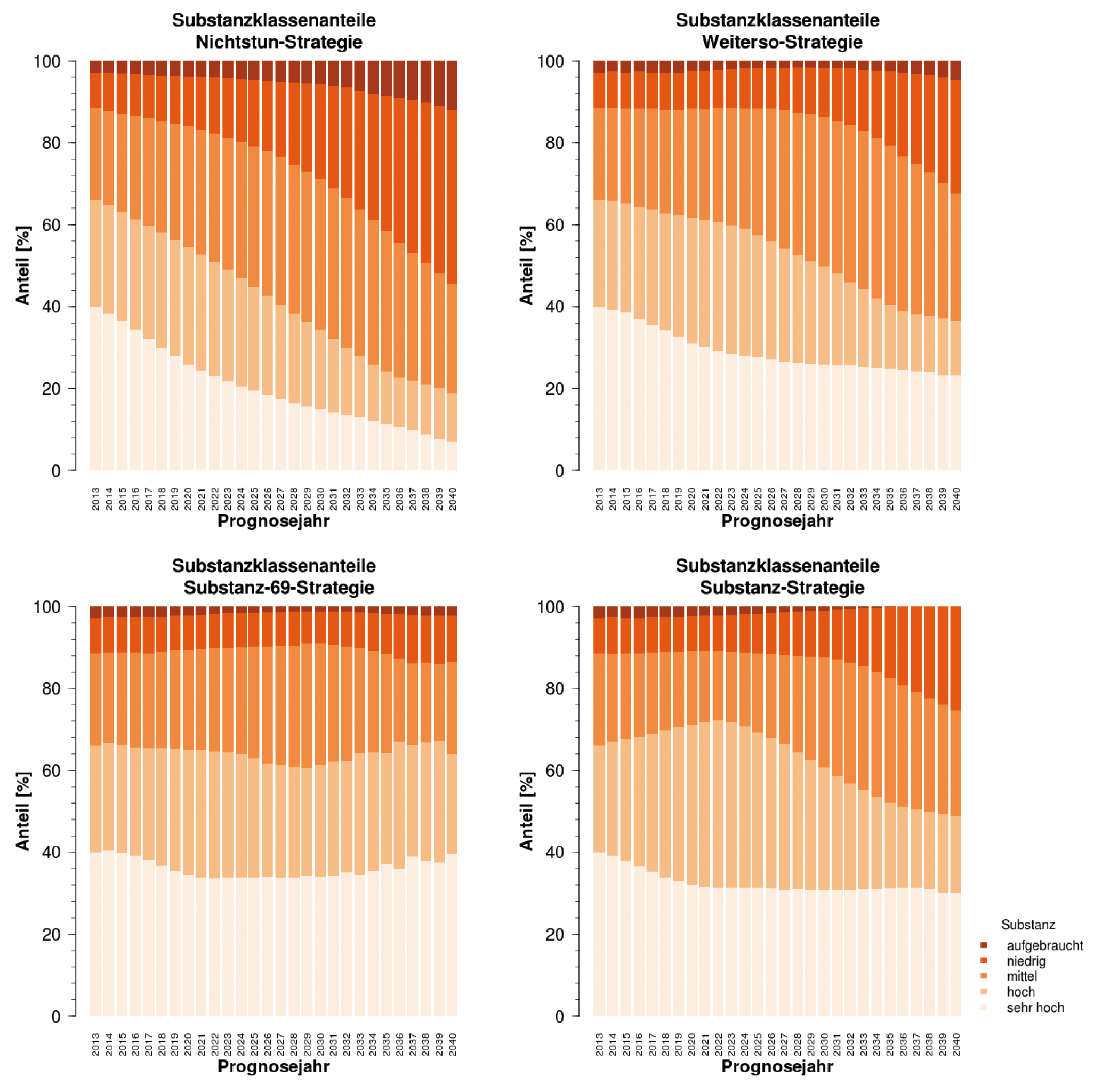 Bei der „Substanz-69-Strategie“ wird trotz des nicht limitierten Mitteleinsatzes keine nennenswerte Verbesserung in den Klassen mit aufgebrauchter und niedriger Substanz erreicht. Erst ab 2030 kommt es zu einer signifikanten Verbesserung in der Substanzklasse „niedrig“.