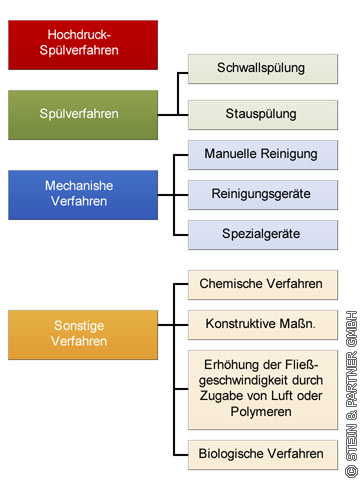Neben den o.a. Anwendungen im Rahmen der Wartung dient die Reinigung auch als vorbereitende Maßnahme für eine Sanierung. Dabei ergeben sich noch zusätzliche Aufgaben, wie z.B. intensive Reinigung der Innenwandung, Entfernung von Korrosionsprodukten, einragenden Anschlussleitungen und -kanälen oder anderen künstlichen Abflusshindernissen. Die in Kanalisationen angewendeten Reinigungsverfahren lassen sich nach [3] einteilen in (Bild 2):