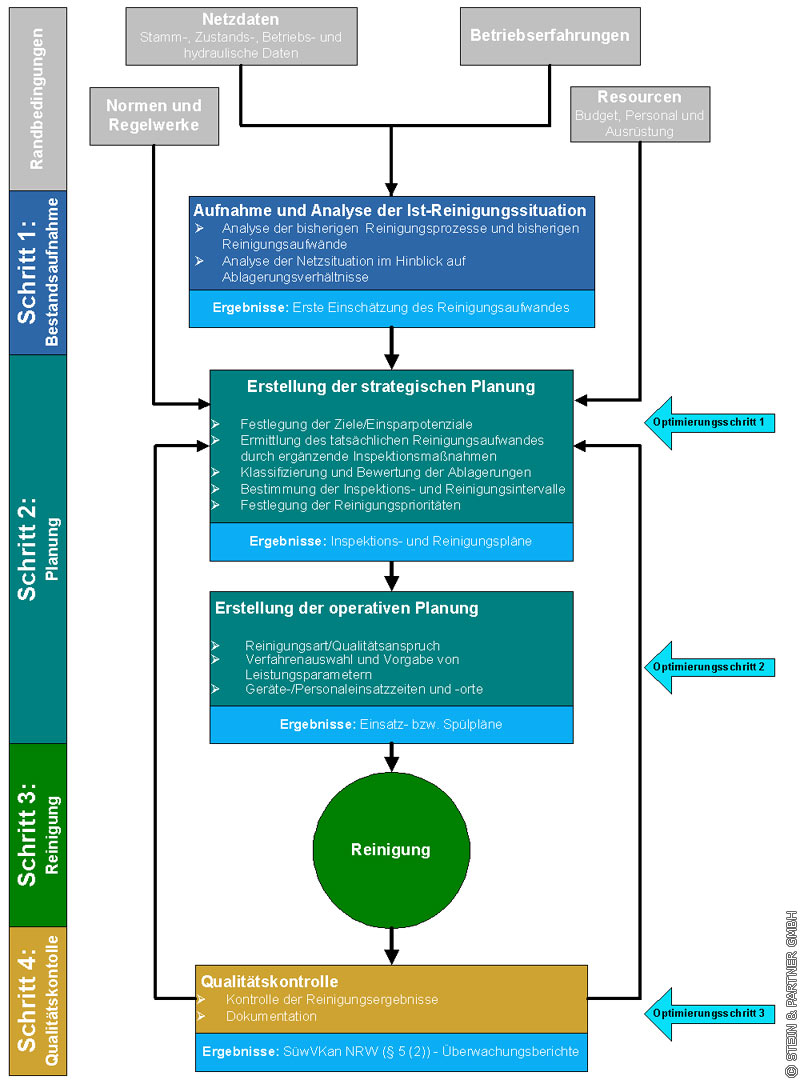 Er sollte auf einem bedarfs- und zustandsorientierten Reinigungskonzept basieren, bei dem gezielt nur die verschmutzten Haltungen gereinigt und dabei der bauliche Zustand des Kanalnetzes berücksichtigt wird. Auf diese Weise sollen die bisher anfallenden Reinigungskosten gesenkt und eine übermäßige Rohrbeanspruchung vermieden werden. Die Einführung dieses Konzeptes lässt sich in vier Schritte strukturieren (Bild 6):