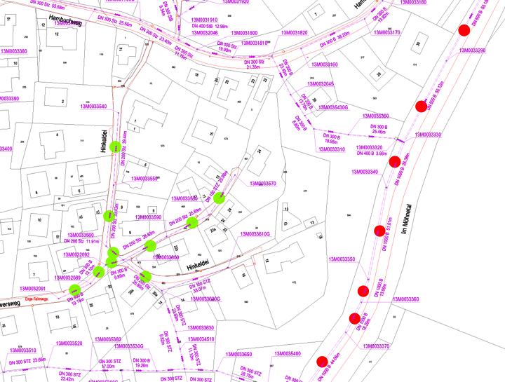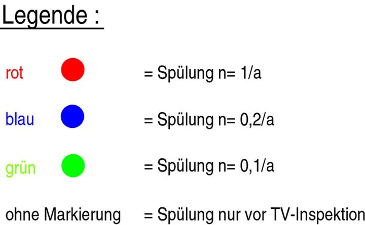 Das GIS besteht aus einer graphischen Oberfläche und einer angebundenen Datenbank (z.B. Access, Oracle usw.), in der alle Haltungsparameter, wie Nennweite, Werkstoff, Haltungslänge, Gefälle, Zustandsbilder usw. hinterlegt sind. Hier wurden zusätzlich die erfassten Netz- und Ablagerungsdaten integriert, verwaltet, analysiert und visualisiert, z.B. durch farbliche Darstellung der verschiedenen Ablagerungsklassen. Unter Nutzung aller o.a. Informationen war es möglich, die zu reinigenden Haltungen eindeutig zu identifizieren und für alle Haltungen den optimalen Reinigungszyklus festzulegen. Die Bandbreite der Zyklen schwankte zwischen jährlich zu reinigenden Haltungen und Netzbereichen, die erst im Vorlauf zur nächsten TV-Inspektion (gemäß SÜwVKan-NRW nach 15 Jahren) gespült werden müssen.