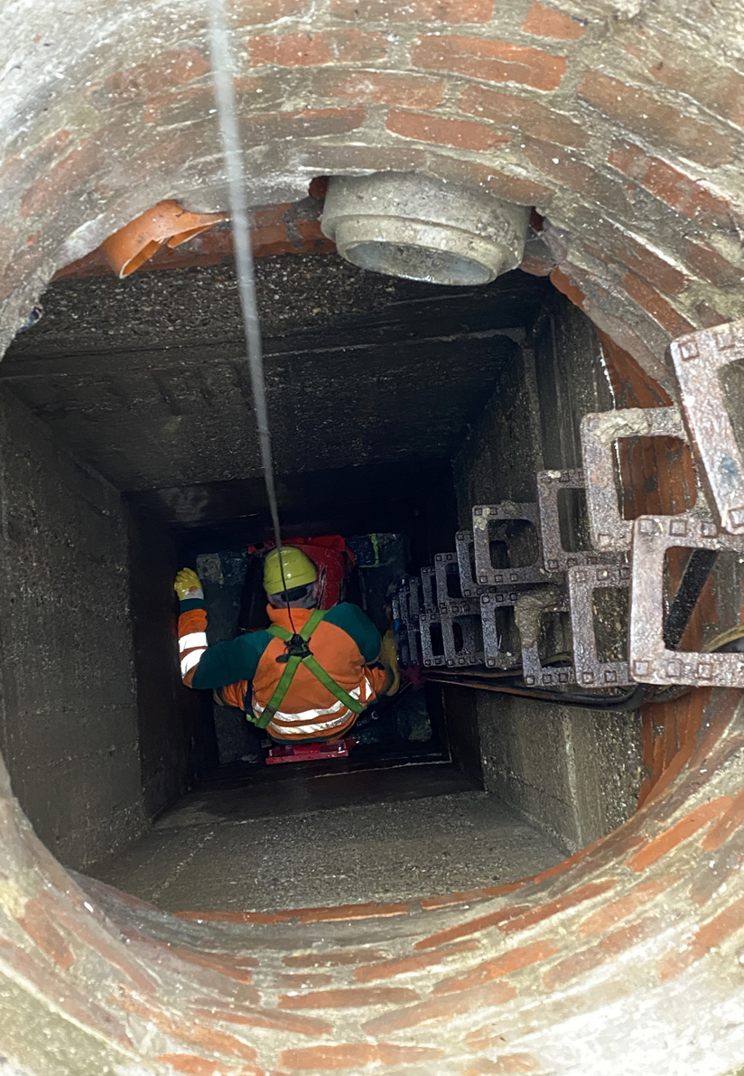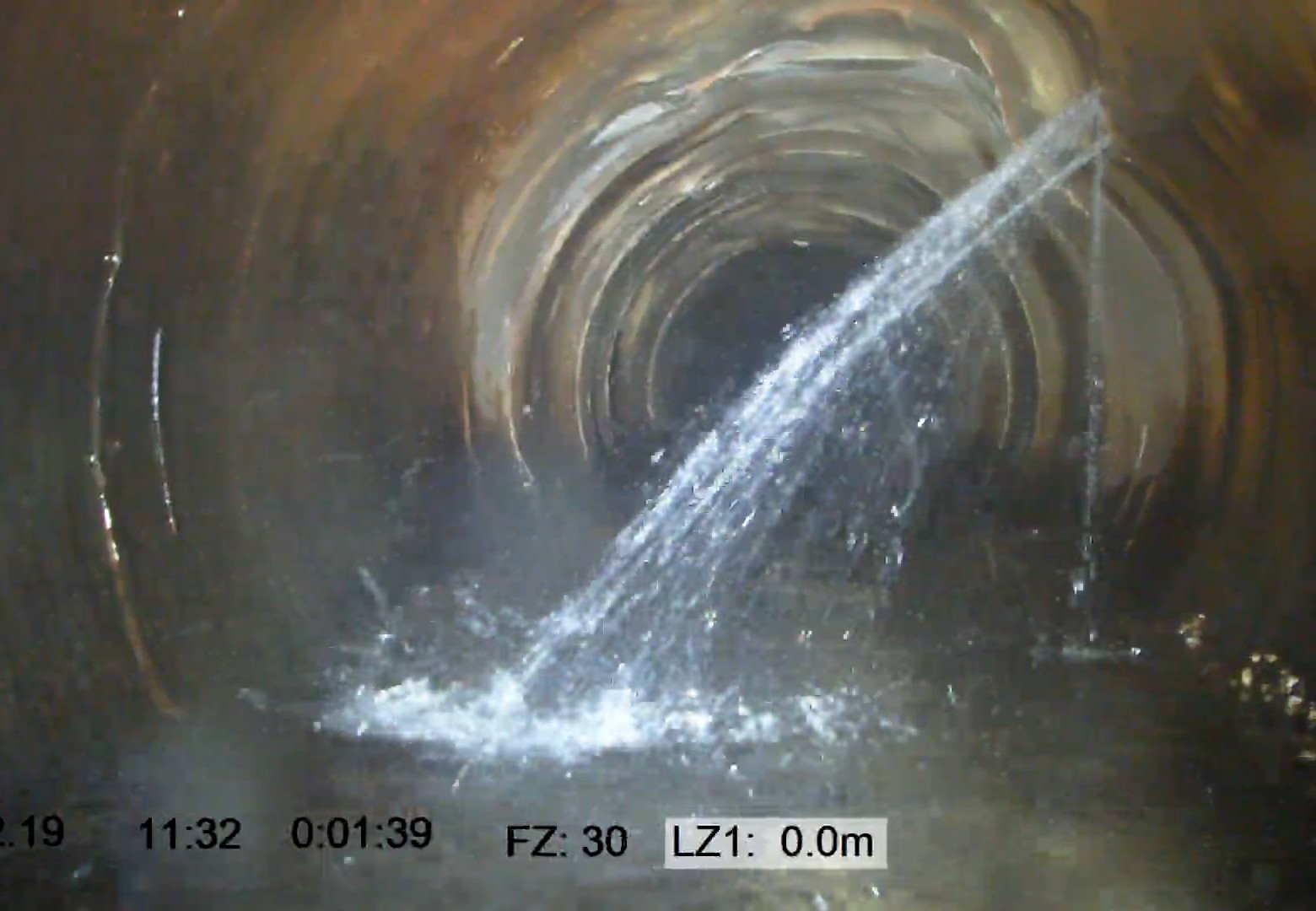 Damals wurden erste Reparaturarbeiten mithilfe eines Kurzliners durchgeführt. Nach über 30 Jahren im Betrieb lösten sich nun allerdings die Lagen des Kurzliners und es kam zu starken Infiltrationen: Fremdwasser gelangte in den Kanal. Dieses wird in der DIN EN 752 als „unerwünschter Abfluss in ein Entwässerungssystem“ definiert und birgt einige Gefahren. Zum einen können die Anlage sowie Kanäle durch viel Fremdwasser überlastet werden. Zum anderen sind nicht selten Störungen im Prozess der Abwasserreinigung die Folge und es kommt zu erhöhten Energiekosten.