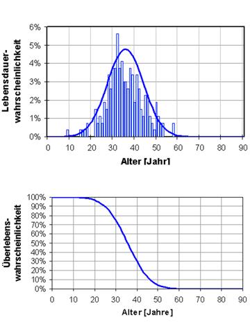 Die Lebensdauer eines Kanals wird demnach als statistische Zufallsgröße betrachtet, der eine Wahrscheinlichkeitsverteilung zugeordnet werden kann. In Bild 2 (oben) ist eine typische Lebensdauerverteilung in Anpassung an die Weibullverteilung abgebildet. Sie beschreibt die Wahrscheinlichkeit mit der ein Baujahrgang ein bestimmtes Alter erreicht. Die Wahrscheinlichkeit mit der ein Baujahrgang ein bestimmtes Alter überlebt wird durch die Überlebensfunktion (Bild 2 unten) beschrieben. Diese wird aus dem Integral der Lebensdauerverteilung ermittelt.