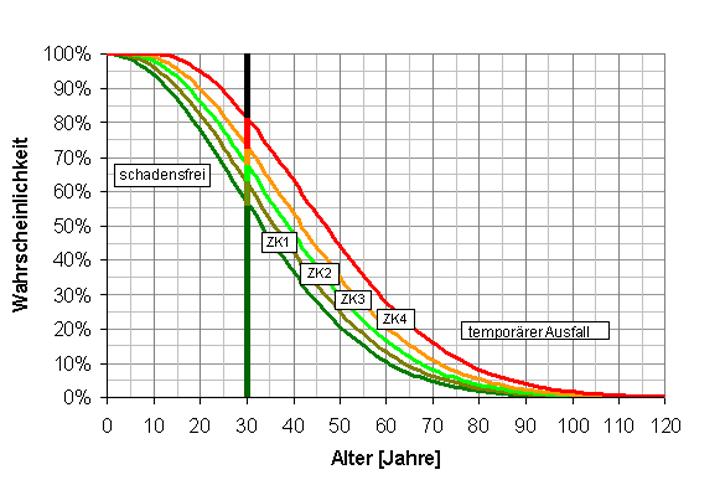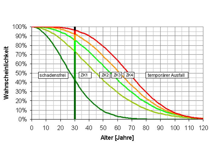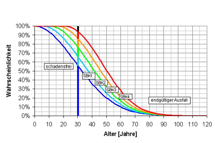 Von besonderem Interesse ist die Überlebensfunktion in dem nicht mehr zulässigen Substanzbereich "endgültiger Ausfall". Diese zeigt den völligen Abbau des Abnutzungsvorrats und damit das Ende der technischen Nutzungsdauer an. Die Wahrscheinlichkeit für einen endgültigen Ausfall beträgt hier 5,9%