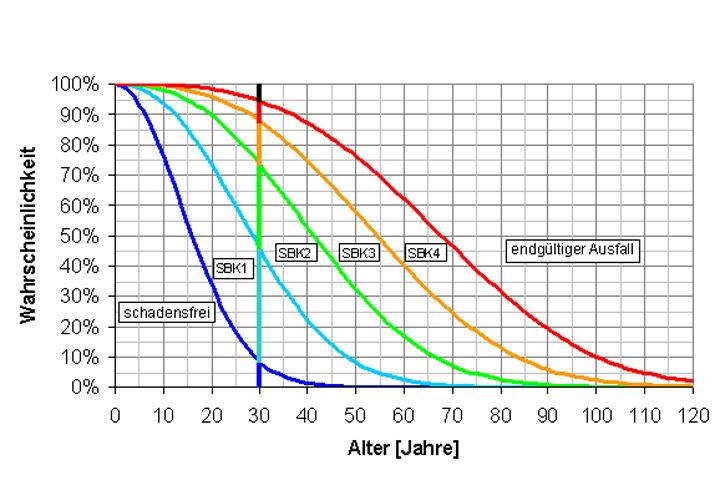 Anhand von statistischen Auswertungen von Inspektionsbefunden werden die unterschiedlichen Verweilzeiten in den einzelnen Zustands- bzw. Substanzklassen ermittelt. Die Übergangswahrscheinlichkeiten in die nächst schlechtere Zustands- bzw. Substanzklasse sind dabei vom betrachteten Zeitpunkt und dem damit verbundenen Alter der untersuchten Haltung abhängig. Dieser Sachverhalt findet seinen Niederschlag darin, dass für den Übergang von einer Zustands- bzw. Substanzklasse zur nächsten jeweils altersabhängige, haltungs- und netzspezifische Überlebenswahrscheinlichkeiten angesetzt werden.