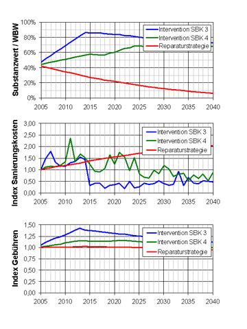 Das Prognosemodell von "STATUS Kanal" bildet eine solide Grundlage für Wirksamkeitsanalysen von Sanierungsentscheidungen. Durch die Vorgabe von Budgetgrößen, ökologischen und hydraulischen Anforderungen sowie weiteren netzspezifischen Randbedingungen können verschiedene Strategien hinsichtlich ihrer Auswirkungen auf die Substanzentwicklung, die Sanierungskosten, die Gebührenhöhe etc. eingehend untersucht werden (Bild 9).