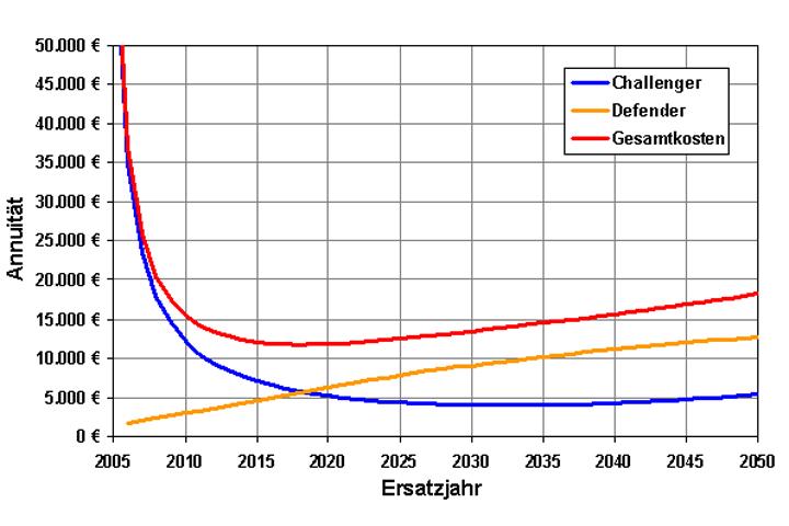 Das Replacement-Modell ermittelt auf dieser Grundlage den Zeitraum innerhalb dessen die Summe der Kostenannuitäten aus Defender und Challenger ein Minimum ergibt (Bild 10).