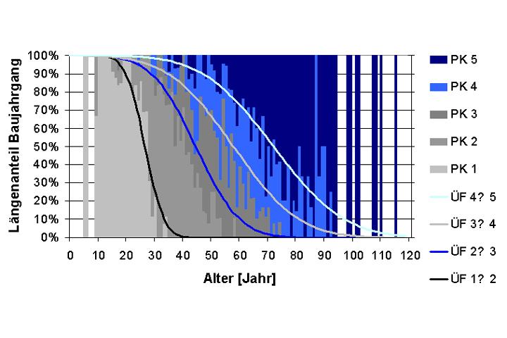 Auch bei diesem Verfahren werden zuerst Überlebensfunktionen ermittelt, im Modell als Übergangsfunktionen bezeichnet. Hierbei werden allerdings die Längenanteile der Baujahrgänge an den jeweiligen Prioritätsklassen (PK) [17] kumuliert und auf 100% normiert. Zur Ermittlung der Übergangsfunktionen werden anschließend die Teilungspunkte der Prioritätsklassen innerhalb der Kohorten mit Glättungskurven (Herzfunktionen [9]), ermittelt durch nichtlineare Regression, miteinander verbunden.