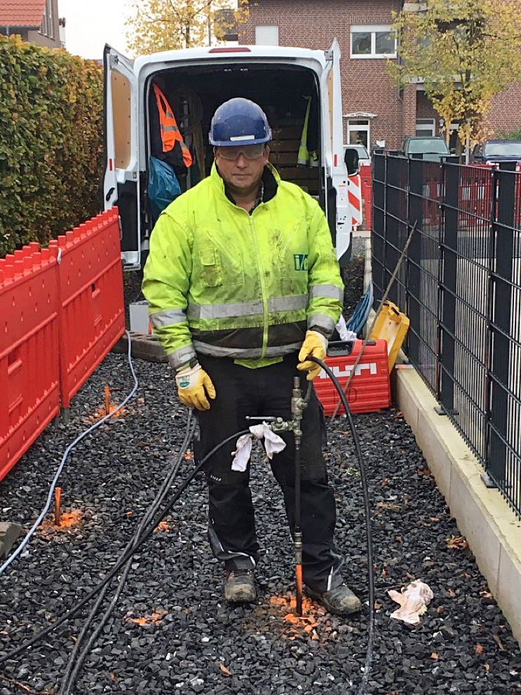 Die Arbeiter treiben die fünf Millimeter starken Rohre (Aussendurchmesser 21 mm) mit Rammblock und Rammhammer in den Boden. Auf einer Breite von etwa zwei Metern mittig über der geplanten Vortriebsachse und damit beidseitig etwa 0,75 Meter neben der geplanten Rohrwandung schlagen sie die Rammlanzen von der Geländeoberfläche aus bis in eine Tiefe von etwa -3,80 m bis -4,80 m unter GOK ein.