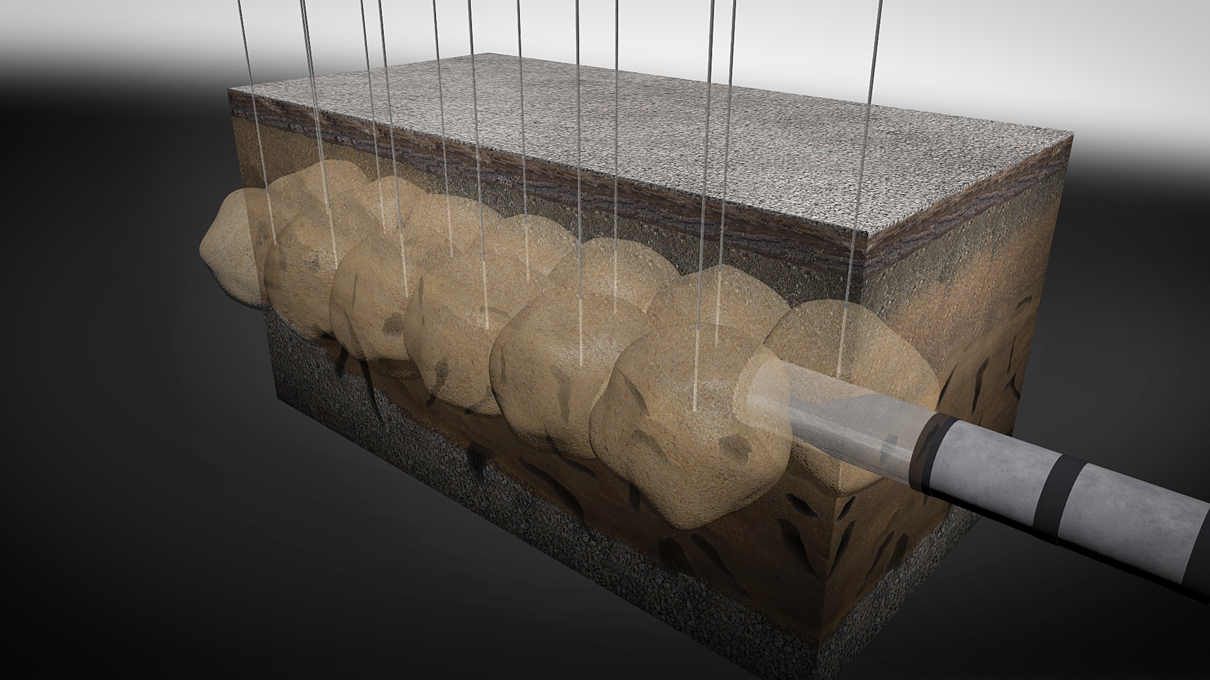 Ziel der Maßnahme ist es, den Boden durchgehend und sicher zu verfestigen. Das soll den Bereich bis etwa ein Meter oberhalb und etwa ein Meter beidseitig neben der Vortriebsachse einschließen, um ein Nachbrechen oder Ausböschen der Bodenschichten beim Vortrieb zu verhindern.