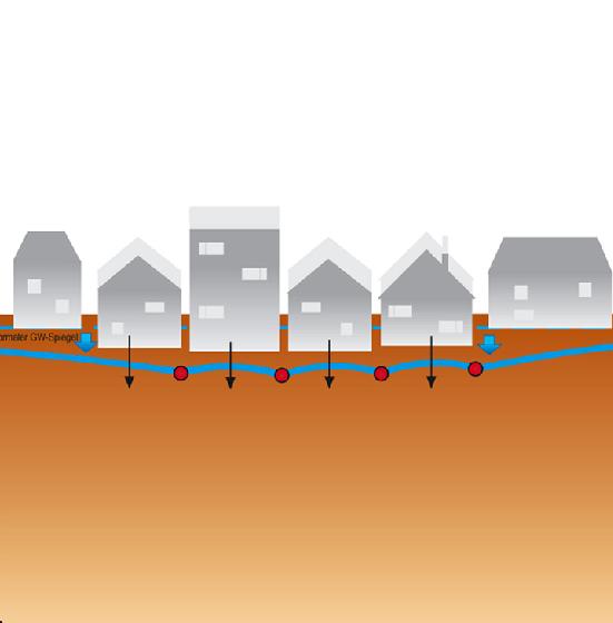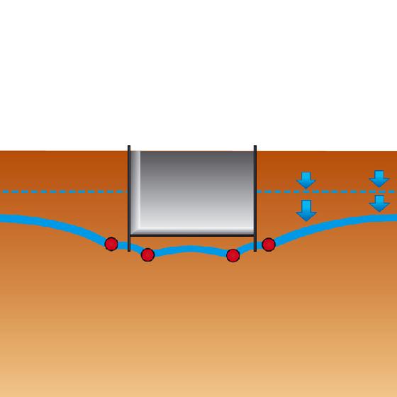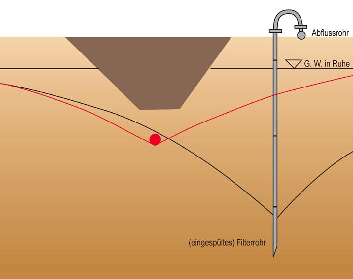 Grundwasserabsenkungen permanenter Art, z.B. in Bergschadensgebieten mit flächigen Geländeabsenkungen und dadurch zu hoch anstehendem Grundwasser, oder Grundwasserabsenkungen vorübergehender Art, z.B. für die Errichtung tiefer Baugruben oder großer Abwasser-Leitungsgräben, offener Tunnelstrecken oder für Tagebaumaßnahmen, werden derzeit noch überwiegend durch eine Vielzahl von kürzeren, vertikalen Förderbrunnen vorgenommen. Diese sehr aufwendige Bauweise kann in vielen Fällen ebenfalls durch horizontalbohrtechnisch verlegte Filterbrunnen ersetzt werden.