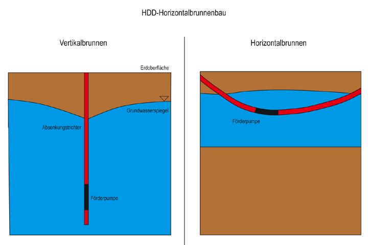Im HDD-Verfahren sind lange verlaufsgesteuerte horizontale Bohrungen möglich. Der Bohrungsansatz kann vor dem Baufeld bzw. der geplanten Baugrube liegen. Das Auftauchen der Bohrung ist auf der anderen Seite des Baufeldes bzw. der Baugrube vorteilhaft. Ganze Brunnenreihen, die von 20 bis 30 Vertikalbrunnen aufgebaut sind, können so durch eine einzige HDD-Brunnenbohrung mit gleicher Leistung ersetzt werden. Pro vertikaler Brunnenreihe ist somit ein unterirdischer HDD-Brunnen mit zwei Förderzugängen (an den Ein- und Ausstiegslöchern) mit gleicher Förderleistung möglich, ohne dass irgendwelche Brunnenköpfe im Baufeld oder in der Baugrube benötigt werden. Der künftige Bauaushubbereich ist somit völlig frei von aufsitzenden Brunnenköpfen und Abförderleitungen und steht der eigentlichen Aushubmaßnahme hinderungsfrei zur Verfügung.