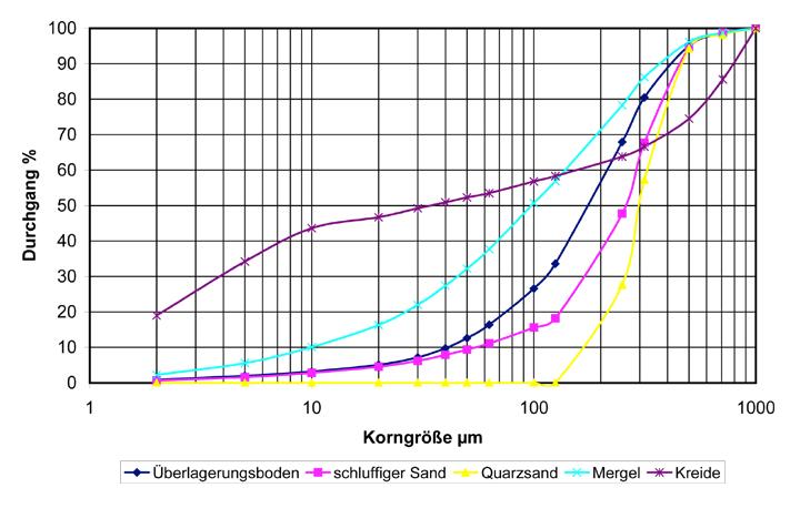 Insgesamt wurden 5 Bodenarten (Bild 8), Feststoffgehalte von 0 bis 400 kg/m? (jeweils in 50 kg-Schritten) sowie 2 Bentonitsorten (HTX und HTX-Spezial der Fa. Ibeco) mit jeweils 2 Bentonitkonzentrationen (30 und 50 g/l Wasser) untersucht. Die Suspensionen wurde nach Herstellerangaben angemischt und dem Versuchskreislauf zugeführt.