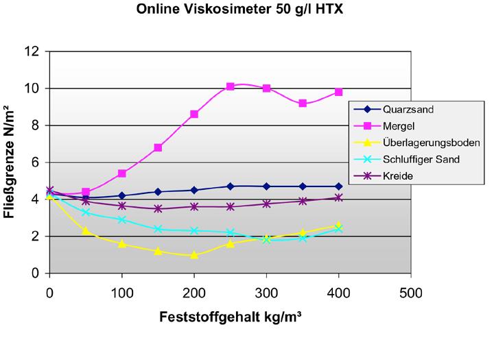 Die umfangeichen Laboruntersuchungen lieferten den Beweis, dass sich die mit dem DMT-Online-Viskosimeter online gemessenen Fließgrenzenkurven der unterschiedlichen Stützflüssigkeitsgemische in Abhängigkeit von Bentonitsorte, Bentonitkonzentration, Feststoffgehalt sowie Bodenart eindeutig reproduzieren lassen, d.h. jede Versuchssuspension wies eine für sie charakteristische Fließkurve auf, welche darüber hinaus mit den Fließgrenzenergebnissen der Kugelharfe korreliert.
