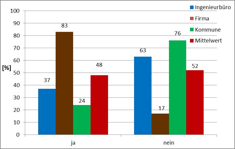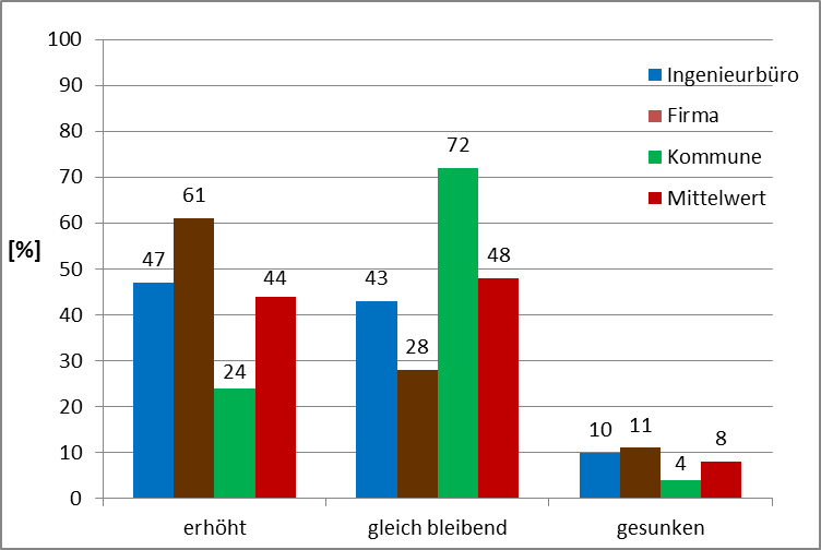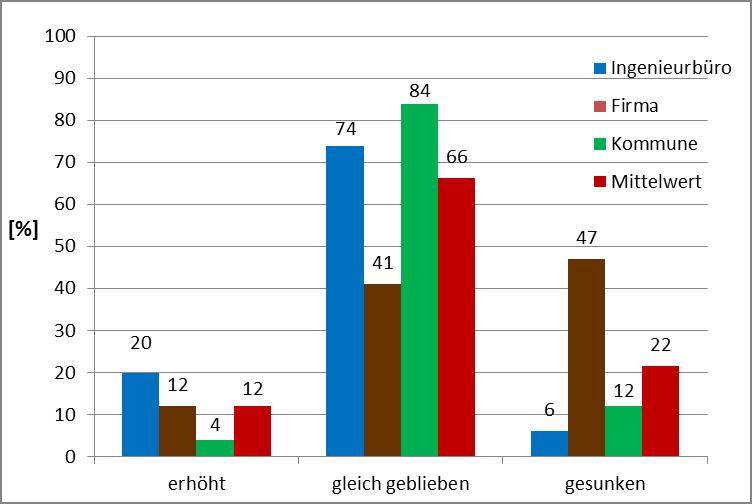 Weniger überraschend ist, dass die Vergütung seitens der Ingenieurbüros und Sanierungsfirmen schlechter beurteilt wird als seitens der Kommunen. Die Sanierungsfirmen sehen hierbei auch eine Verschlechterung gegenüber dem Vorjahr. Die Gewinn- bzw. Preissituation wird dagegen von allen drei Gruppen als konstant beurteilt.