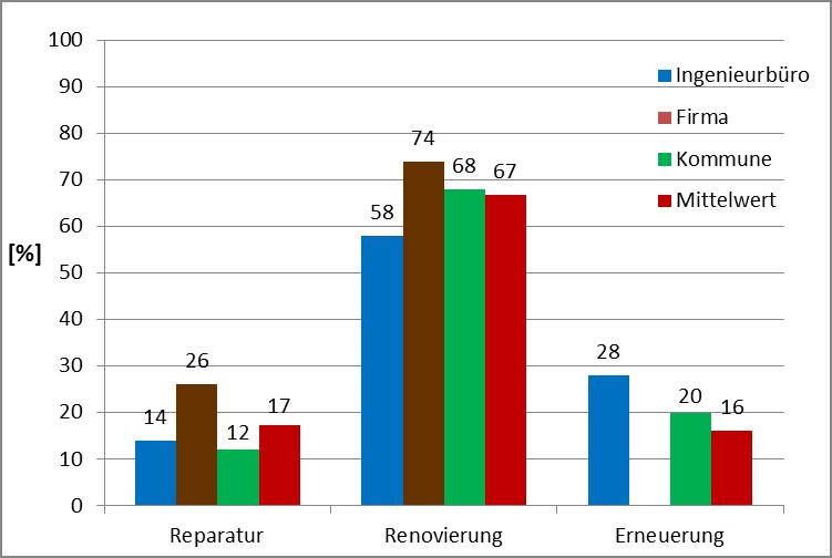 Die Investitionen und Auftragsvergaben in der Sanierung werden von den beteiligten Kommunen konstant mit leichter Erhöhung eingeschätzt. Seitens der Ingenieurbüros und der Sanierungsfirmen fällt die Beurteilung zu Umsatz und Auftragsbestand positiver aus, was sicherlich in den individuellen Marktanteilen begründet liegt. Ihr Personal haben vor allem die Sanierungsfirmen, zum Teil aber auch die Ingenieurbüros erhöht, während bei den Kommunen das Personal im Sanierungsbereich gleichbleibend bis rückläufig ist. Einigkeit herrscht dagegen bei den Sanierungsverfahren: Erhöht hat sich vor allem der Anteil der Renovierung – ein Ergebnis, welches in dieser Deutlichkeit von den Autoren nicht unbedingt erwartet wurde.