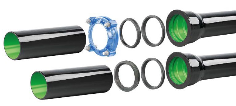 Sämtliche Steckmuffen-Systemprodukte von vonRoll – Rohre, Formstücke und Absperrarmaturen aus duktilem Gusseisen – wurden mit dem flexiblen, hauseigenen Verbindungssystem vonRoll HYDROTIGHT längskraftschlüssig gesichert.
