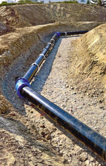 Für die Erschließung der neuen Wasser- und Löschwasserversorgung des Bauareals entschied sich die zuständige Behörde von Luterbach für Vollschutzrohre aus duktilem Gusseisen vom Typ ECOPUR des Schweizer Herstellers vonRoll. Dieses Rohrsystem wird seit Jahren für die Erneuerung der Wasserinfrastruktur in der Gemeinde eingesetzt. ECOPUR-Rohre aus duktilem Gusseisen verfügen über eine integrale Innen- und Außenbeschichtung aus Polyurethan (PUR), die nach EN 545 [2] als verstärkte Umhüllung klassifiziert ist – geeignet für den Einsatzbereich in Böden jeglicher Aggressivität. Durch den Einsatz des diffusionsdichten Guss-Rohrsystems mit einer integralen Innen- und Außenbeschichtung aus Polyurethan (PUR) wird die im GWP geforderte Betriebssicherheit der Wasserversorgung auf dem alten Industriestandort sichergestellt. Die hydraulisch glatte Polyurethan (PUR)- Auskleidung mit der minimalen Rauheit k ≤ 0,01 mm sorgt für beste Durchflusswerte bei geringerem Pumpaufwand und Energieverbrauch und senkt so die Betriebskosten beim Transportieren des Grundwassers.