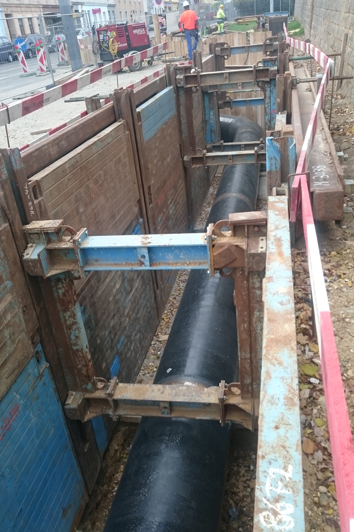 Die außen angebrachte Trägerkonstruktion nahm in dieser Bauphase die komplette Belastung auf. Durch das vergrößerte Einbaufenster ergab sich als zusätzlicher Nutzenfaktor eine noch wirtschaftlichere Rohrverlegung. Für Grabenabschnitte mit querenden Versorgungsleitungen hielt das ausführende Unternehmen zusätzlich ein Modul des sogenannten einschienigen innerstädtischen Linearverbaus vor, der ein Dielenkammerelement zur Führung von Kanaldielen mit den Systembauteilen des Linearverbaus kombiniert.