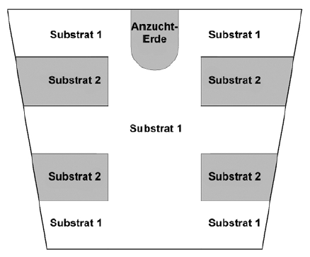 Den Einfluss der Porenräume auf das Wurzelwachstum veranschaulichen die Bilder 3 bis 6. Für die in den Bildern 3 bis 5 dargestellten Versuche im Botanischen Garten der Ruhr-Universität Bochum wurde eine künstliche Schichtung von zwei Substraten mit unterschiedlicher Porosität in Pflanzgefäßen angelegt. Als Substrat mit hohem Porenanteil und guter Durchwurzelbarkeit wurde Komposterde ausgewählt, wie sie für die Containerkultur im Botanischen Garten der Ruhr-Universität Bochum eingesetzt wird. Für die Herstellung von Bodenbereichen mit geringem Porenanteil und geringer Durchwurzelbarkeit wurde Bentonit gewählt. Das eingesetzte Material besteht aus Tonmineralien mit einer mittleren Partikelgröße von 0,063 mm. Die geringe Größe der Partikel hat zur Folge, dass die für das Wachstum von Wurzeln notwendigen Räume (Bodenporen) mit einer Größe ab 100 μm nicht vorhanden sind [5]. Die Substrate wurden in horizontalen Schichten wechselweise um eine zentrale Säule aus einem der Substrate eingebracht. Den Schichtaufbau veranschaulicht der dargestellte schematische Längsschnitt in Bild 3. Bild 4 zeigt ein seitlich geöffnetes Pflanzgefäß.