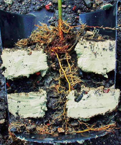 Allein der Blick auf dieses Bild lässt erahnen, dass keine Wurzeln in den porenraumarmen Bentonit eingewachsen sind, was sich nach dem Aufschneiden des Pflanzgefäßes inklusive Bodenkörper und dem Freispülen der Wurzeln mit Wasser bestätigte. Die Wurzeln hatten sich durch die Komposterde bis auf die Sohle des Pflanzgefäßes ausgebreitet (Bild 5). Zwischen den Betonitschichten reichten sie sogar beinahe bis an den vertikalen Rand des Pflanzgefäßes heran [2].