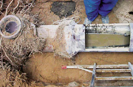 In der Praxis bestätigte sich dieses labortechnisch simulierte Verhalten des Wurzelwachstums. Die in Bild 6 dargestellte Verwurzelung wurde in einer Tiefe von 7 m angetroffen. Die Wurzeln hatten sich entlang einer Hausanschlussleitung ausgebreitet, die über das dargestellte Formstück an den Abwasserkanal angeschlossen war. Sie waren bis in den Leitungsgraben des Hauptkanals und dort im Zwickel des Abwasserkanals weitergewachsen. In dieser Tiefe benötigt das wachsende Wurzelwerk eine ausreichende Versorgung mit Sauerstoff. Es liegt die Vermutung nahe, dass dieser Sauerstoff aus den nicht gasdichten Steckmuffen-Verbindungen der Hausanschlussleitung und des Hauptkanals im Sinne des Sauerstoffmodells stammte.