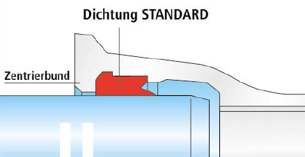 Die STANDARD–Steckmuffen-Verbindung (Bild 8) ist in ihrem konstruktiven Konzept und in ihrer Funktion mit der TYTON® -Steckmuffen-Verbindung vergleichbar. Ihre Verbindungsmaße sind in Deutschland in DIN 28603 [6], (Form C), von DN 80 bis DN 2000 festgelegt. Die Dichtung besteht aus Gummi mit einer einzigen Härte.
