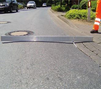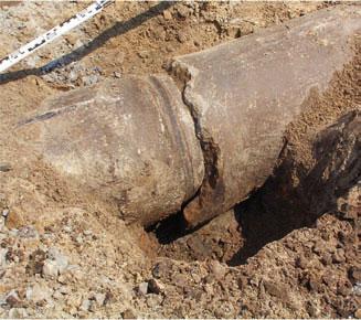 Die Bilder 12 bis 14 zeigen die Fahrbahnbefestigung der untersuchten innerörtlichen Hauptverkehrsstraße, die anhand der Schwerverkehrsbelastung in die Bauklasse II gemäß RStO 01 einzuordnen ist. Anstelle der somit erforderlichen Dicke der Asphaltbefestigung von 22 cm weist sie lediglich eine Asphaltaufbaudicke von ca. 8 cm auf. Durch Aufgrabung konnte gezeigt werden, dass in dem quer unter der Fahrbahn mit einer Rohrüberdeckung von 60 cm hindurch geführten Regenwasserkanal eine vollständig ausgebrochene Muffenverbindung vorhanden war (Bild 15). Anhand der nachfolgend erläuterten Ergebnisse einer FEM-Berechnung wurden die mechanischen Zusammenhänge aufgezeigt.