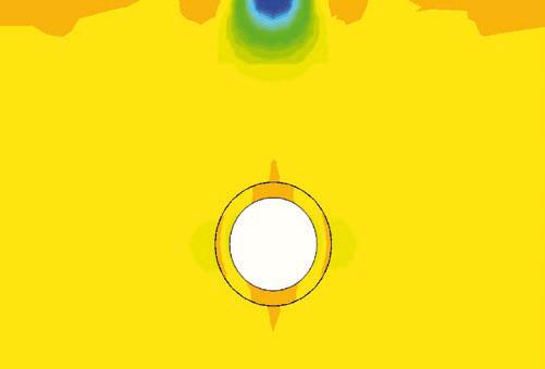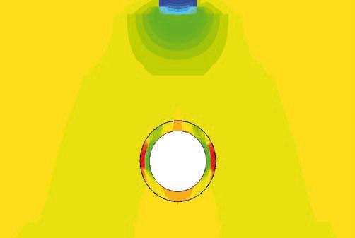Bild 21: Durch FEM-Berechnung ermittelter Verlauf der Vertikalspannungen σz (qualitativ) infolge der Einzelradlast von 100 kN eines SLW 60 unter der Annahme, dass eine entsprechend RStO 01 bemessene Fahrbahnbefestigung vorhanden gewesen ware (Farben dunkel-orange: Zugspannungen; Farben hell-orange, gelb, grun, blau: Druckspannungen)