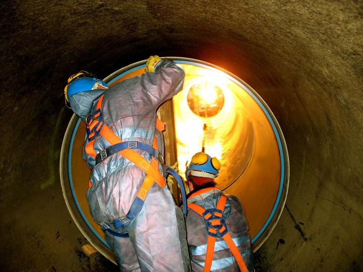 Eine spezielle Herausforderung für die KUT-Techniker hatte der West-Düker dennoch zu bieten: Hier wurde eine kriegsbedingte Schadstelle durch eine Innenausmauerung stabilisiert, die zwar über Jahrzehnte gehalten hatte, aber während der Sanierung nicht entfernt werden konnte. Dort installierte man eine Reduzierung auf DN 1200 mit anschließender erneuter Ausweitung auf DN 1600, was unter anderem bedeutete, dass hier von beiden Seiten aus am Düker gearbeitet werden musste.