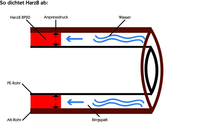 Die Wirkungsweise: Harz8 RP20 verfügt über eine hervorragende Klebewirkung auf dem jeweiligen Altrohr aus Materialien wie Steinzeug, Beton, GFK und anderen. Da es nach der Aushärtung nicht mehr schrumpft, dichtet es bei richtiger Anwendung auch zuverlässig gegen das PE-Rohr ab. Sollte zudem noch Wasser im Ringspalt gegen die Abdichtung mit Harz8 drücken, dehnt sich dieses noch minimal weiter aus, so dass definitiv kein Wasser mehr durch die Abdichtung dringen kann.