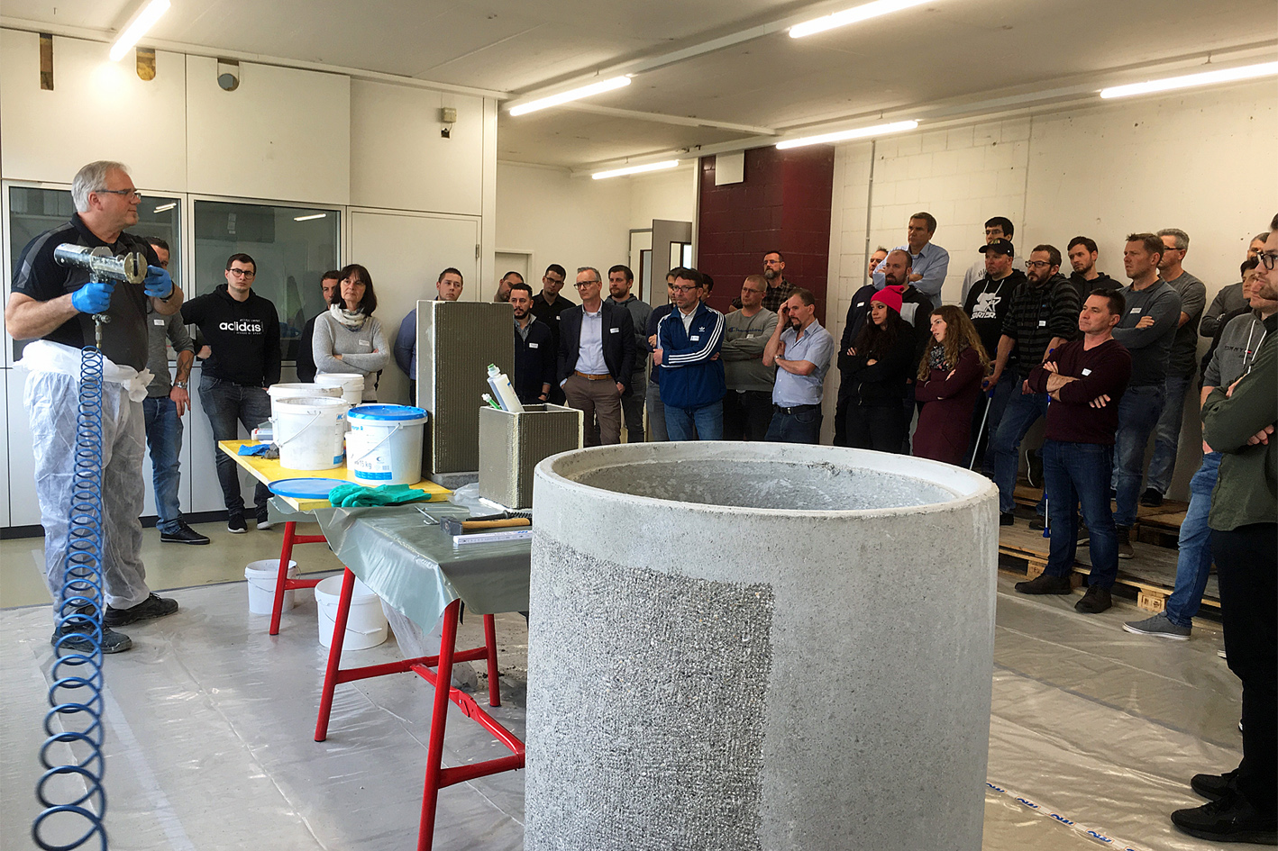 Darüber hinaus wurden bei der wieder einmal ausgebuchten Veranstaltung die einzelnen Sanierungsschritte von der Untergrundvorbereitung über die Abdichtung bis hin zur mineralischen Reprofilierung und Beschichtung sowie die zugehörige Qualitätssicherung ausführlich behandelt und auch selbständig praktisch angewandt.