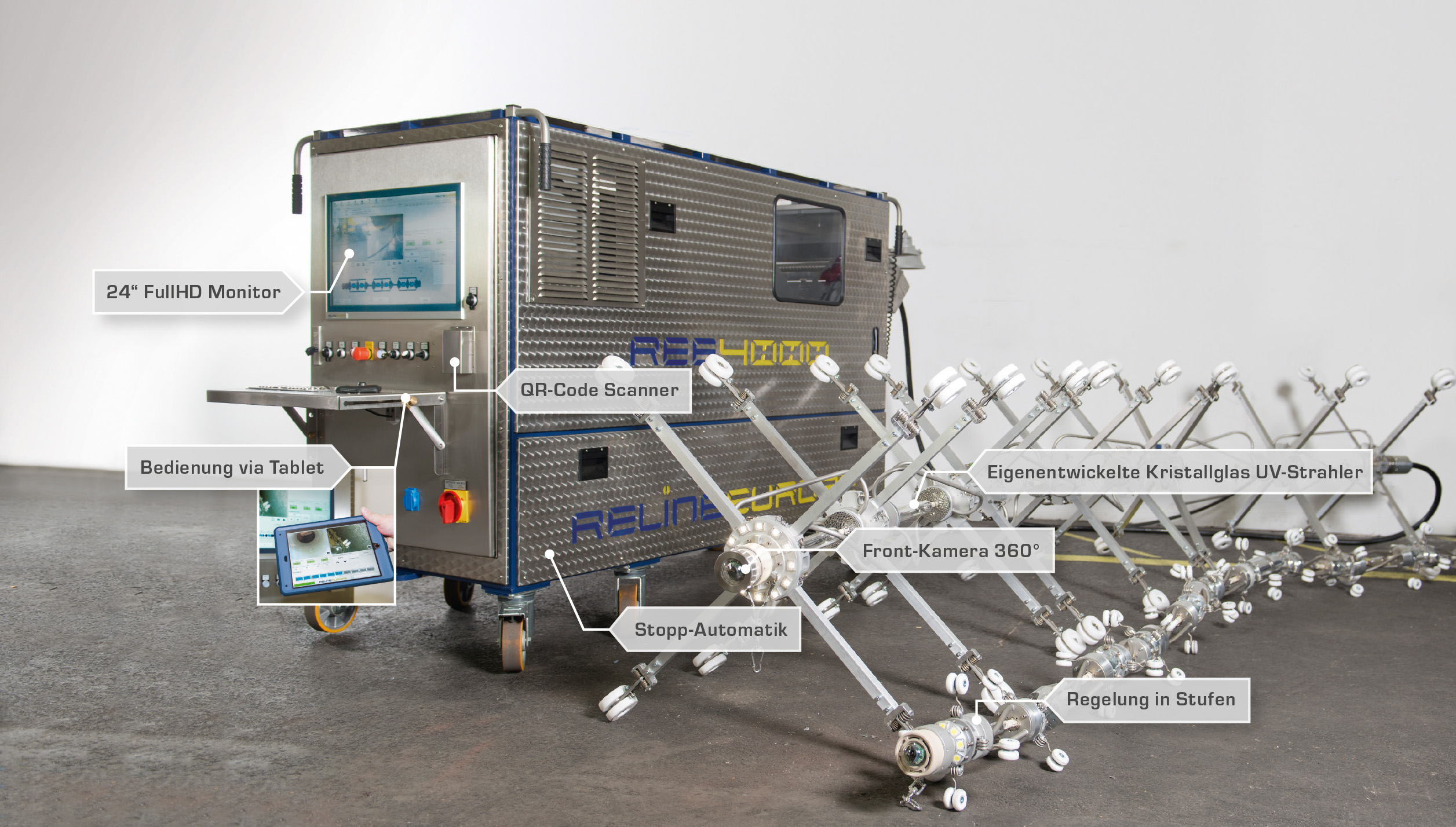 Neben einer maximalen Gesamt‐Lichtleistung von 24.000 Watt, mit der UV‐lichthärtende Schlauchliner auch mit hohen Wandstärken bis zu einer Dimension von DN 1800 rein mit UV‐Licht ausgehärtet werden können, ist es mit der REE4000 auch erstmals möglich, den Aushärteprozess weitgehend automatisiert auszuführen. Die Wirtschaftlichkeit der Anlage spricht für sich, wie Beispiele der Aushärtegeschwindigkeiten eindrucksvoll belegen. So wurden bereits Kanäle DN800, 110m in nur 1 Stunde und DN1400, 103m in nur 2 Stunden ausgehärtet.