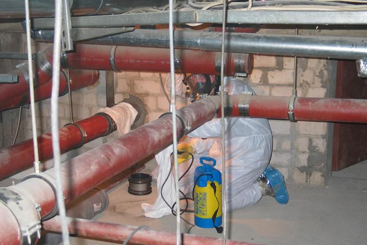 Das City Center Leverkusen wurde vor rund 30 Jahren eröffnet. Mittlerweile sind vor allem die Leitungsnetze in die Jahre gekommen und viele Rohre und Rohrverbindungen schadhaft. "In einem ersten Schritt wurden die Regenwasserleitungen im gesamten Komplex erneuert, in diesem Jahr werden die sanitären Leitungen neu verlegt", erklärt Sandor Toth-Sagi, der verantwortliche Planer und Bauleiter vom IBE Ingenieurbüro F. TGA-Haustechnik Dipl.-Ing. C. F. Hentzel. Rund 500 m Abwasserrohre sind in dem 210 m x 90 m großen Zwischengeschoss zu erneuern. In einem ersten Arbeitsschritt werden sukzessive neue Rohre parallel zu den alten Leitungssträngen eingebaut. "Aufgrund der kreuz- und quer in der Leitungszone verlaufenden Leitungen ein äußerst zeitaufwändiges Unterfangen", wie Toth-Sagi zugibt. Vor allem der An- und Abtransport des Materials gestaltet sich mühsam. Zudem müssen die Arbeiter in den Bereichen, in denen Asbestzement verarbeitet worden ist, mit Vollschutzanzügen und Atemmaske arbeiten.