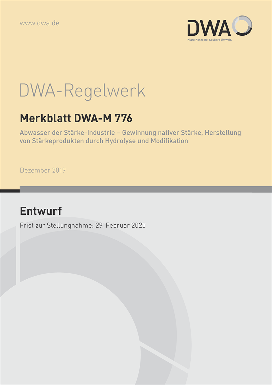 Die Deutsche Vereinigung für Wasserwirtschaft, Abwasser und Abfall e. V. (DWA) hat den Entwurf des Merkblatts DWA-M 776 „Abwasser der Stärke-Industrie – Gewinnung nativer Stärke, Herstellung von Stärkeprodukten durch Hydrolyse und Modifikation“ vorgelegt, der hiermit zur öffentlichen Diskussion gestellt wird und möchte das Merkblatt DWA-M 187 Retentionsbodenfilteranlagen – Sonderanwendungen, Hinweise und Beispiele" erarbeiten.