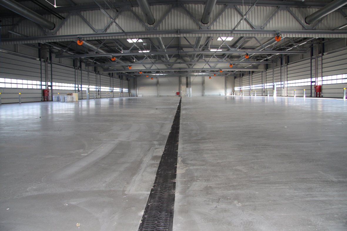 Bei der Planung war zu berücksichtigen, dass auch im Innenbereichen der großen Hallen Oberflächenwasser abgeleitet werden muss und dass die Rinnenstränge den hohen Lasten der schweren Fahrzeuge standhalten. Zum Einsatz kamen deshalb Tiefbaurinnen vom Typ ACO DRAIN® Powerdrain V 175/200 P. Der massive, 8 mm starke Kantenschutz, sowie die Zargen und Gussstegroste aus EN-GJS (Belastungsklasse F 900) ermöglichen das Befahren mit besonders hohen Radlasten.