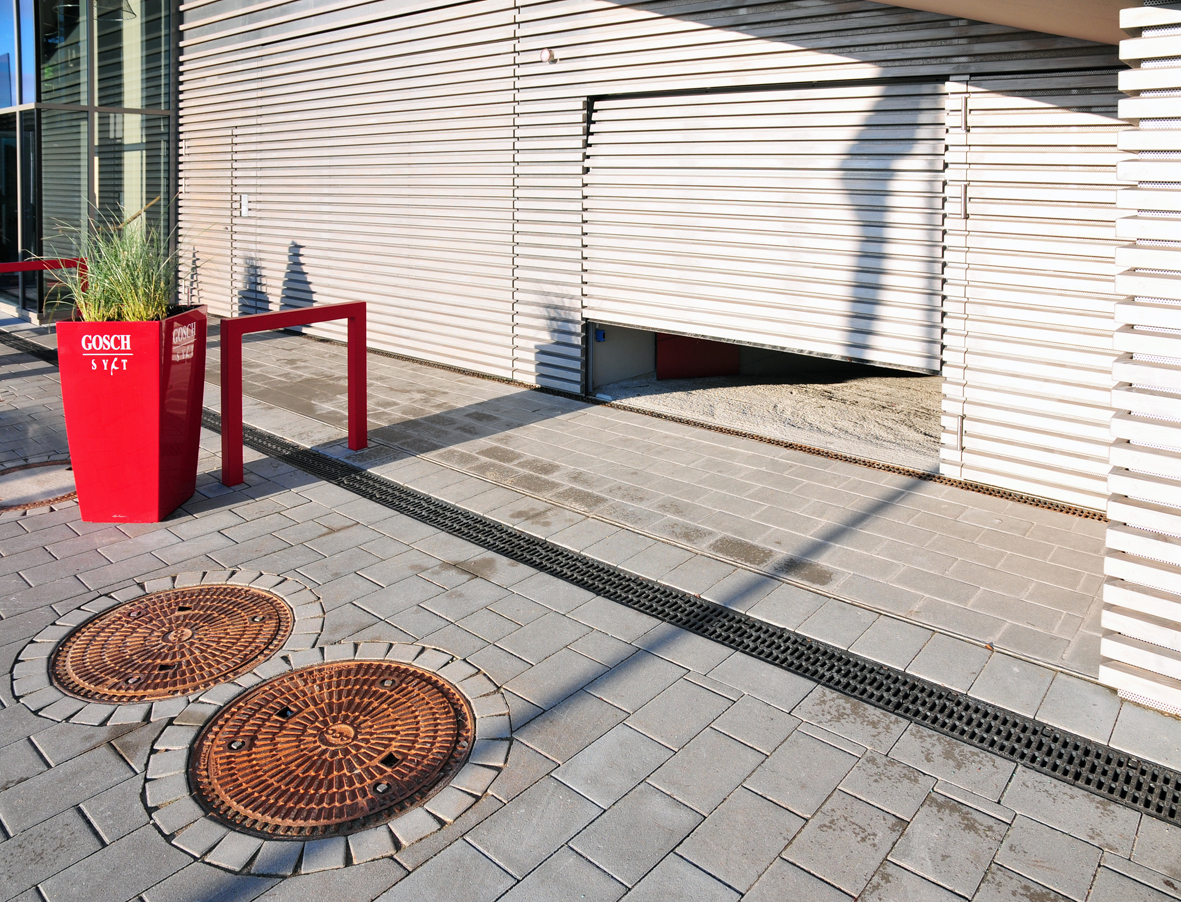 Zur Aufnahme des Oberflächenwassers vor dem Gebäude wurde ein Rinnenstrang aus ACO DRAIN® Powerdrain Entwässerungsrinnen der Baureihe V 175 / 200 P mit einer Nennweite von 175 mm und einer Bauteillänge von 100,0 cm installiert. Der Einlaufquerschnitt der Roste von 685 cm²/m garantiert eine schnelle Aufnahme des Oberflächenwassers, auch bei extremen Klimaverhältnissen.
