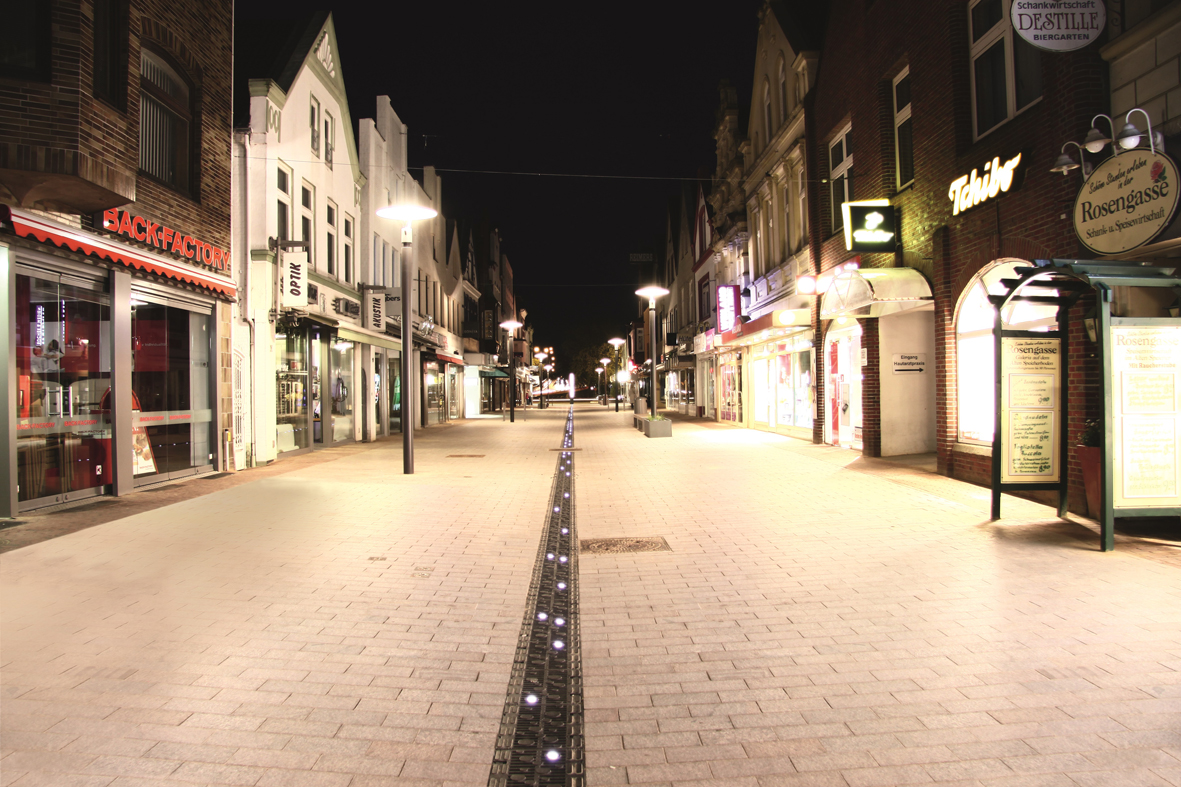 Die ca. 2.000 m² große Gesamtfläche der Fußgängerzone wird durch einen mittig angeordneten, rund 200 m langen Rinnenstrang ACO DRAIN® Powerdrain mit Design-Gussrost und Lichtinstallation entwässert. Unter Verwendung der ACO Freestyle Rinnenabdeckungen und ACO Eyeleds entwarfen die Landschaftarchitekten kessler.krämer aus Flensburg, hier speziell für den Einsatz in Kombination mit der ACO DRAIN® Powerdrain, ein Oberflächen- und Lichtdesign.