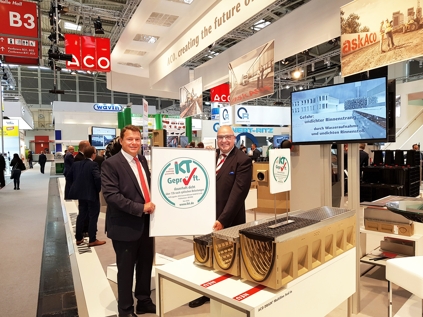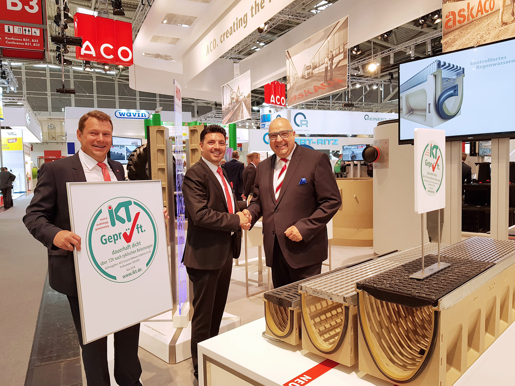 Am ersten Tag der IFAT 2018 in München überreichte Roland W. Waniek, Geschäftsführer des IKT - Institut für Unterirdische Infrastruktur, das „IKT-Geprüft“-Siegel für die Produktfamilie „ACO DRAIN Multiline Seal in“ an ACO-Geschäftsführer Francesco Vitale und ACO-Entwässerungschef Michael Müller. Die Entwässerungsrinnen mit der integrierten EPDM-Dichtung hielten im 72-stündigen IKT-Test mit 500.000 Lastzyklen dicht.