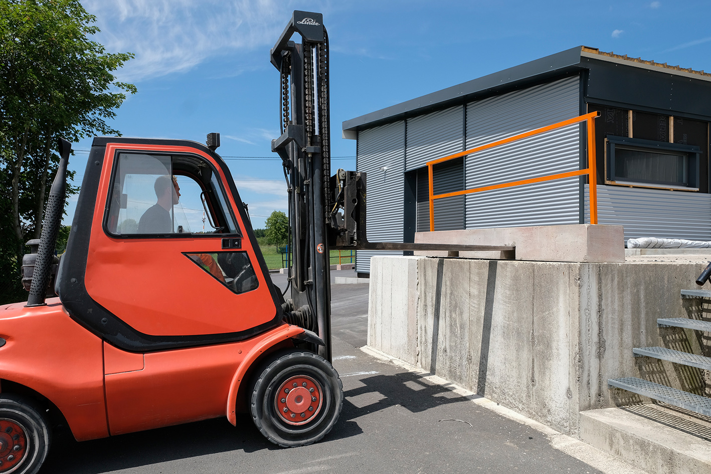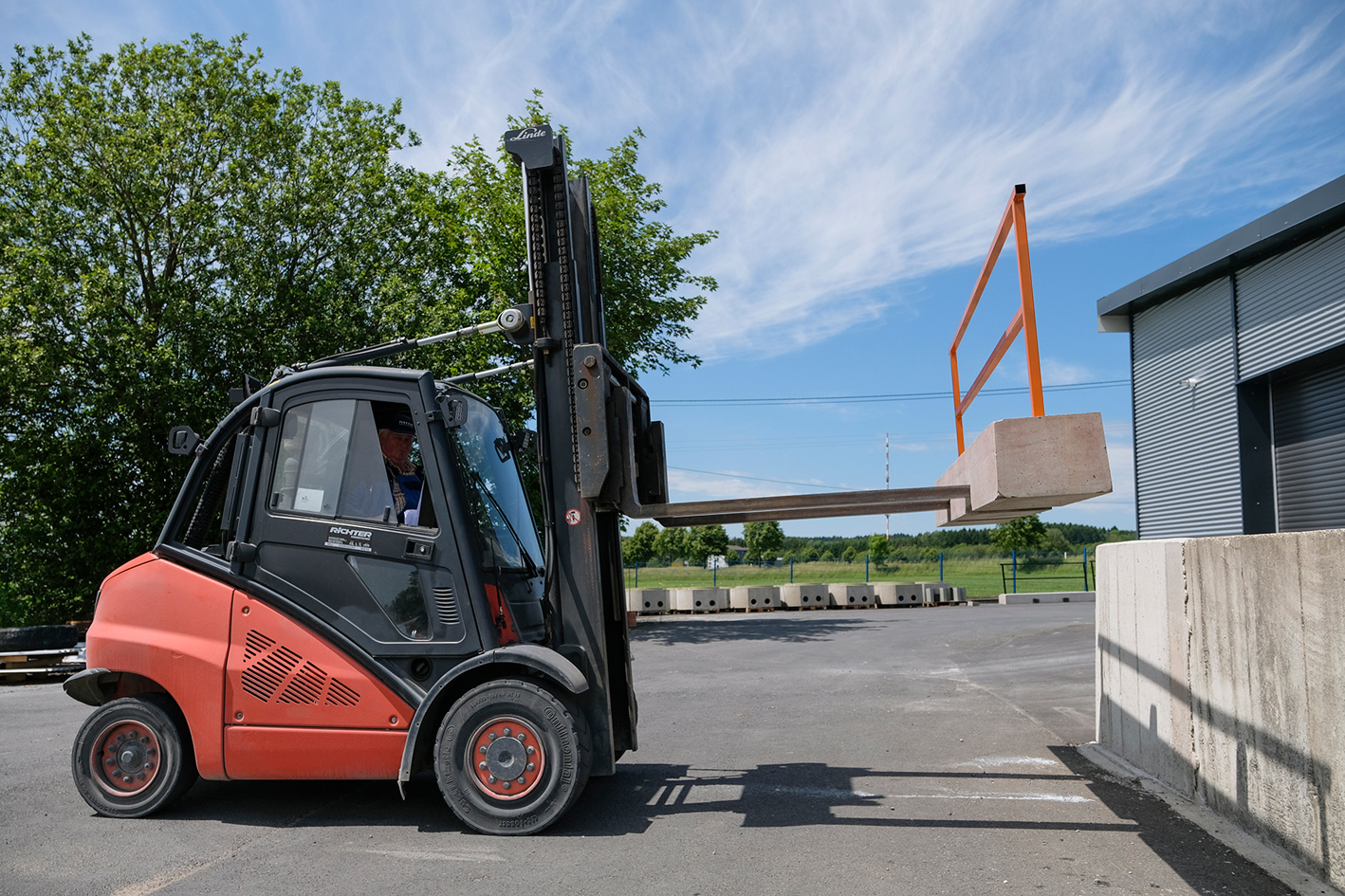 Die neue Absturzsicherung von Fasel besteht aus einem Stahlbetonbalken mit den Abmessungen 3,00 m x 0,40 m x 0,30 m. Der Balken, der mit Aussparungen für eine Staplergabel produziert wird, wiegt rund 800 kg und ist damit auch mit leichtem Baugerät gut verfahrbar.