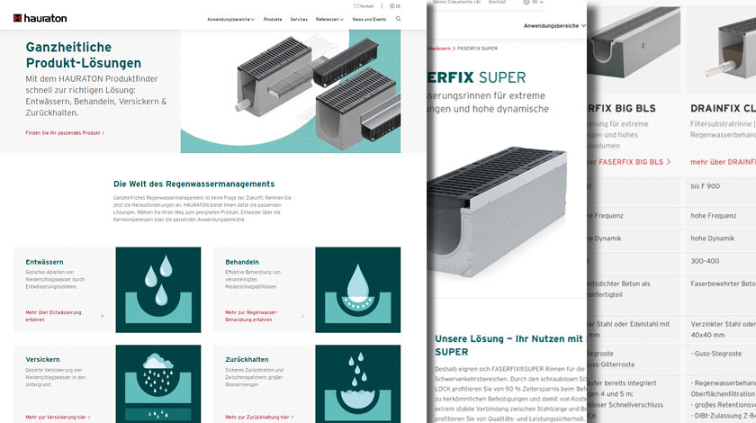 Die Produkte werden in einer neuen Einteilung der Kernkompetenzen – Entwässern, Behandeln, Versickern und Zurückhalten – präsentiert. Eine stark verfeinerte Suchfunktion liefert blitzschnell alle Informationen zu spezifischen Recherchen. Vier verschiedene Wege führen zum gesuchten Produkt: entweder über die Übersicht in der Navigation, über den Produktfinder, über die Anwendungsbereiche oder über die Kernkompetenzen.