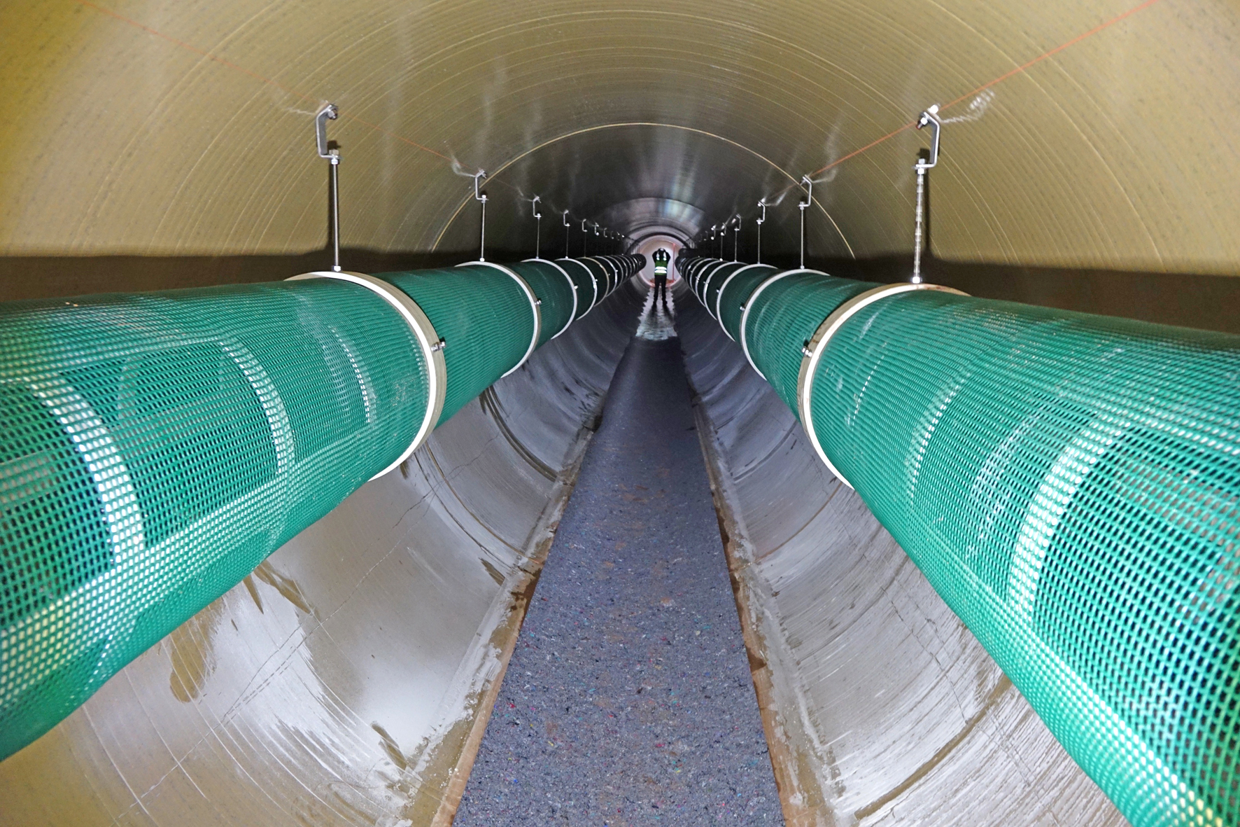 Die beiden kürzeren Rohre sind 10 m, die längeren 40 m lang. Darüber hinaus ist das Stauraumsystem mit einem GFK-Drosselschacht DN 2400 und einem GFK-Entlastungsschacht DN 3400 mit einem Kelch in DN 2000 für eine Entlastungsmenge von 3360 l/s ausgestattet. Der Stauraum selbst ist begehbar und zeigt das für GFK-Rohre übliche sehr gute Ausspülverhalten.