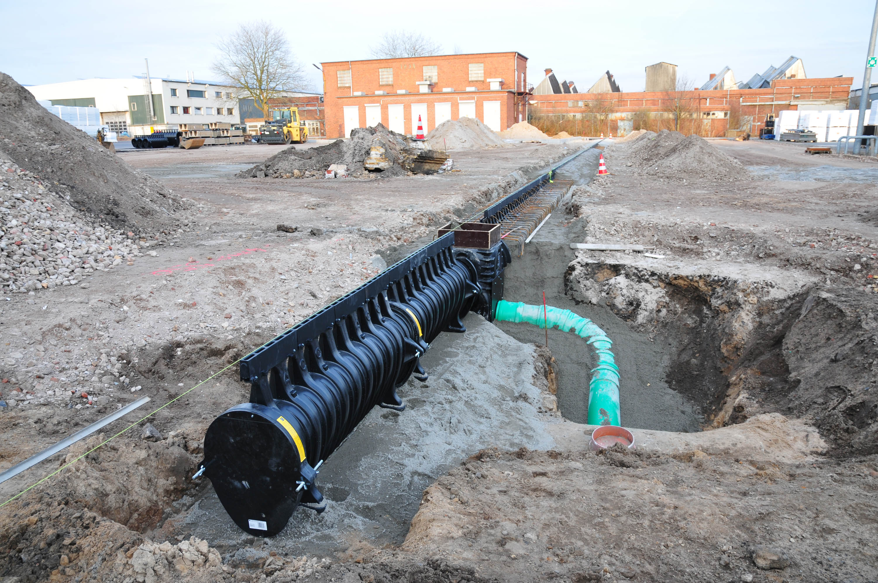 Eine weitere Möglichkeit, um Wasser zwischenzuspeichern, ist das Schaffen möglichst großer Hohlräume durch Füllkörperrigolen wie ACO Stormbrixx. Diese Variante ist gut geeignet für große versiegelte Flächen, wie z. B. Stadien mit großen Dachflächen. Aber auch im innerstädtischen Bereich kann dieses Prinzip angewandt werden, wie das Prinzip der sogenannten Klimafliese von Tredje Natur in Kopenhagen zeigt.