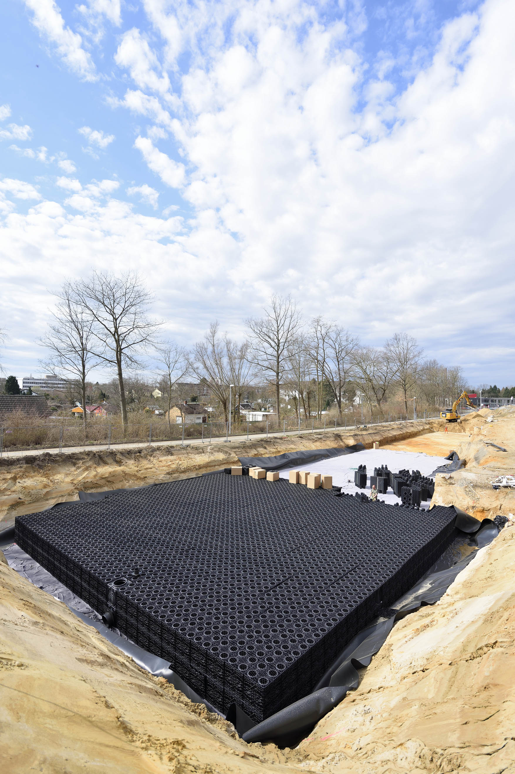 Bei nicht versickerungsfähigem Boden muss das Wasser bei Starkregen zwischengespeichert werden. Hierfür bieten sich mehrere Produktlösungen an. Die Retentionsrinne ACO Qmax ist gleichzeitig Oberflächenentwässerung und Rückhaltung in prinzipieller Form eines Stauraumkanals. Durch die Einlauföffnungen an der Oberfläche wird das Regenwasser gesammelt und bei normaler Niederschlagsmenge in die Kanalisation abgeleitet.