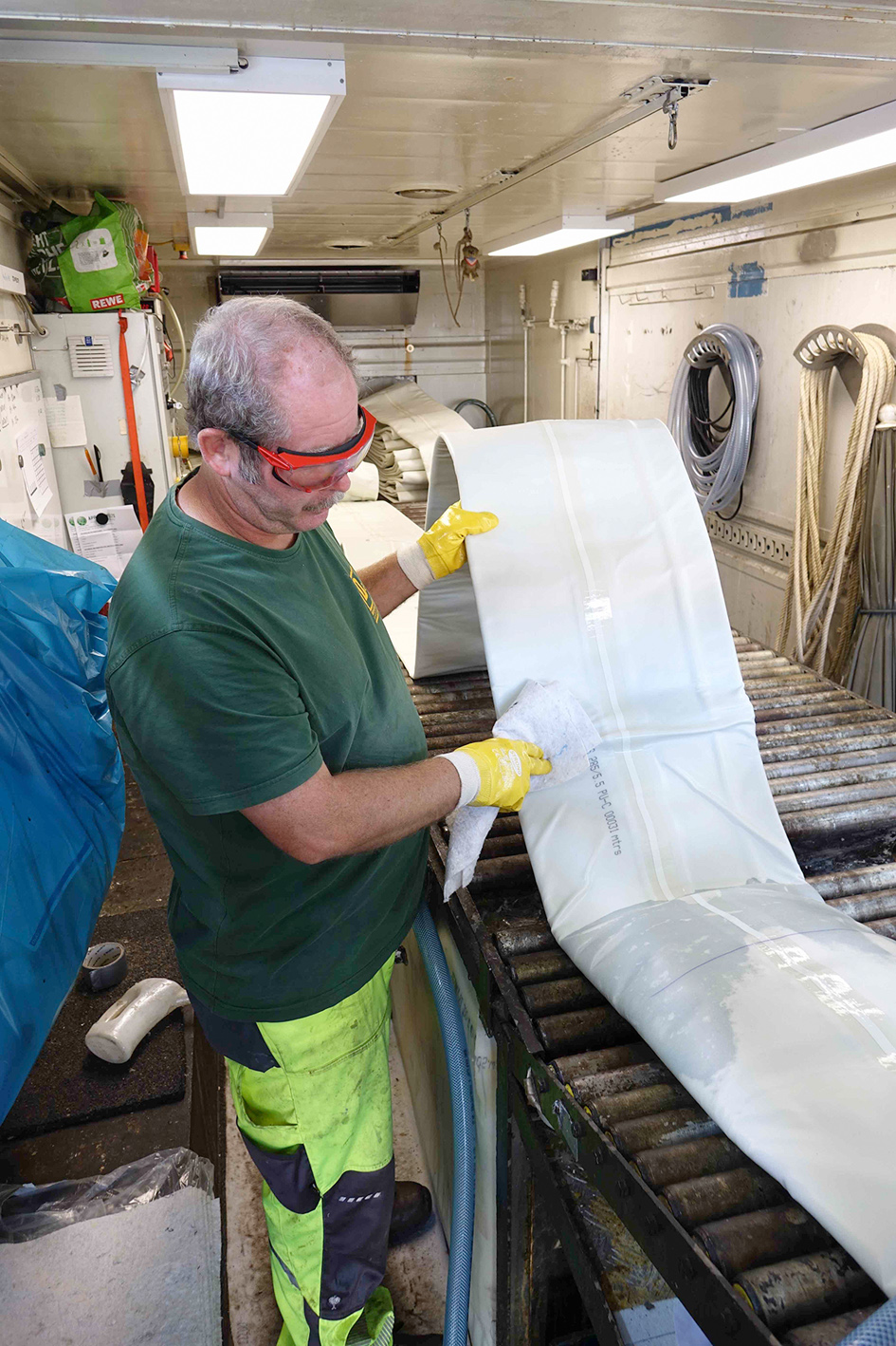 Dieser war notwendig, um das Altrohr vor weiteren Beschädigungen zu schützen und um den Kontakt des Liners mit dem im Düker vorhandenen Wasser zu verhindern. Der nächste Arbeitsschritt war dann die Vorbereitung des Nadelfilzschlauches in der Nennweite DN 285 und mit einer Wandstärke von 5,5 mm in der CityLiner-Mischanlage.