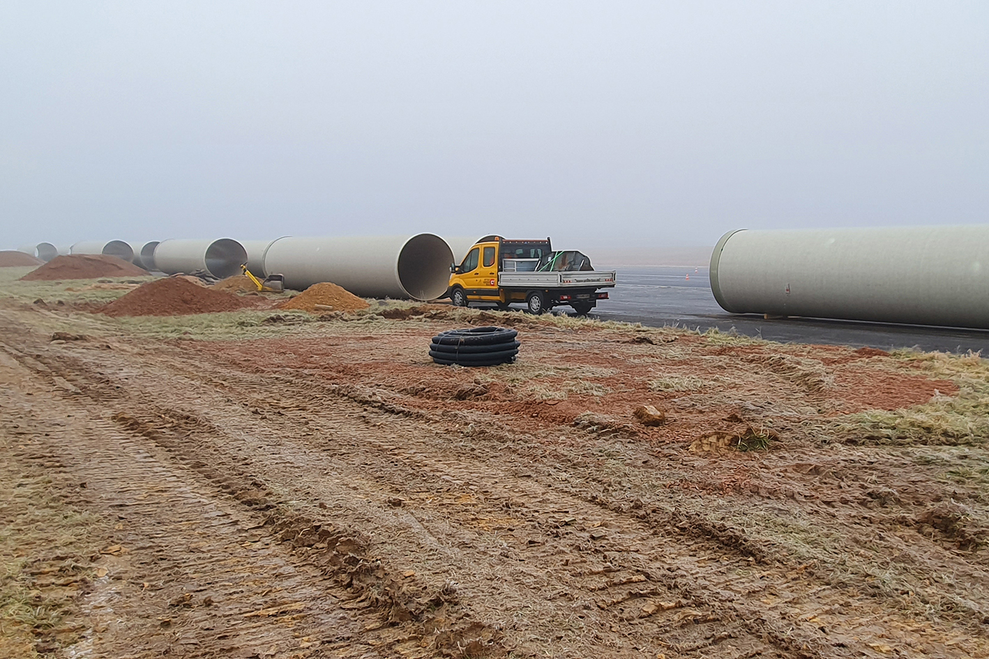Durch die Verwendung von GFK konnte so eine höhere Verlegeleistung erzielt und weitere Kosten eingespart werden. Für den Einbau habe man, laut Ragge, einen 120 Tonnen Autokran auf der Start- und Landebahn platziert. Das sei vom Gewicht der Rohre eigentlich nicht unbedingt notwendig, aber sehr praktikabel gewesen. So wurden die jeweils rund 6,6 Tonnen schweren Rohre in den geböschten Graben gehoben und verlegt.