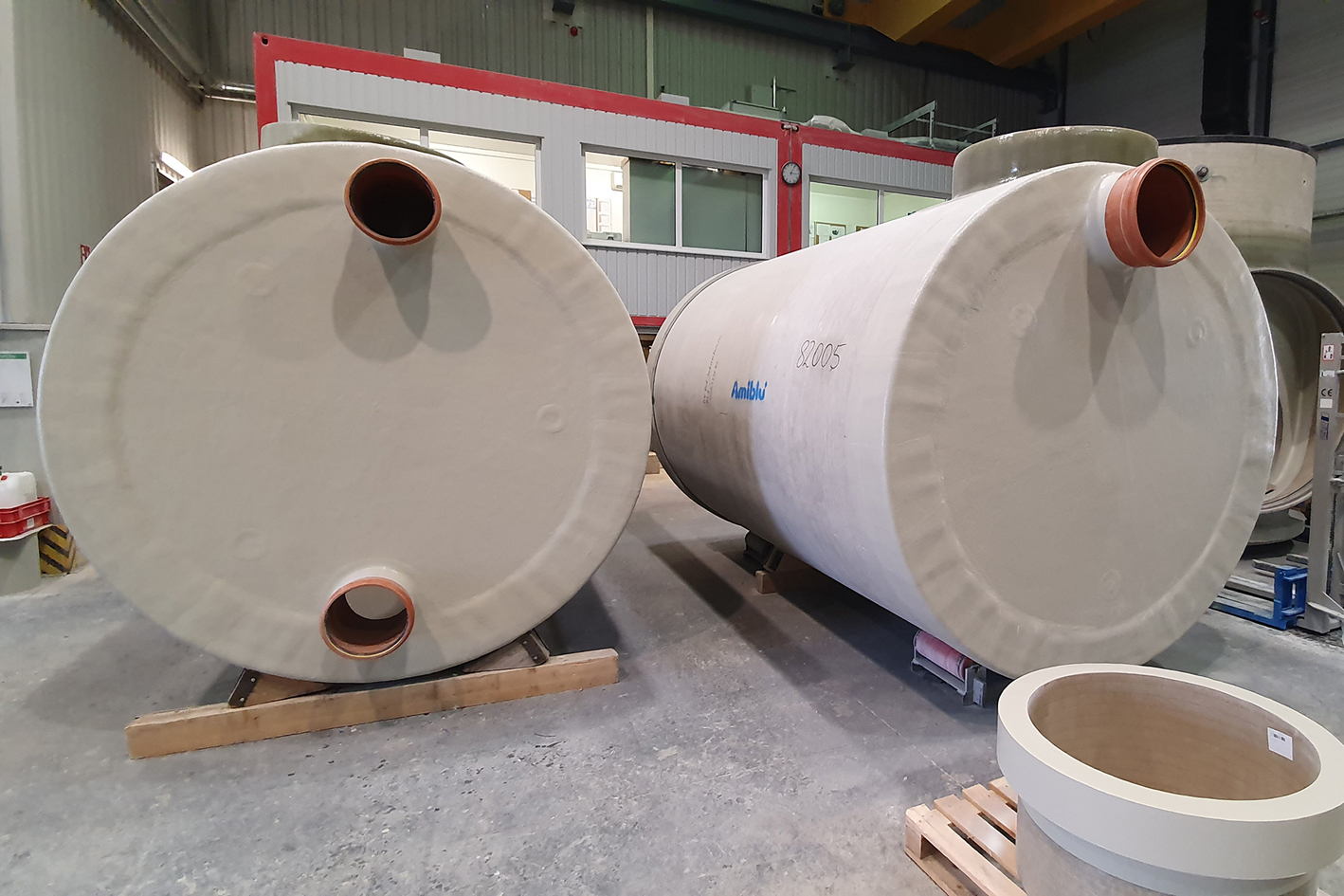 Der Stauraumkanal besteht aus insgesamt 20 gewickelten Flowtite GFK-Rohren mit jeweils 12 Meter Länge und zwei vier Meter langen Bauteilen für die Enden. Über die gesamte Länge sind am Anfang, Ende und in der Mitte in Summe drei Einstiegmöglichkeiten zur Kontrolle angeordnet. Alle Zugänge sind als Tangentialzugänge werkseitig von Ambilu gefertigt worden. Das Kopf-Bauteil verfügt stirnseitig über einen Zulauf, während das End-Bauteil neben einem in der Sohle angeordneten Ablauf in den Pumpschacht auch einen Überlauf im Scheitel hat. Der mittlere tangentiale Zugang ist in ein Rohrelement integriert.