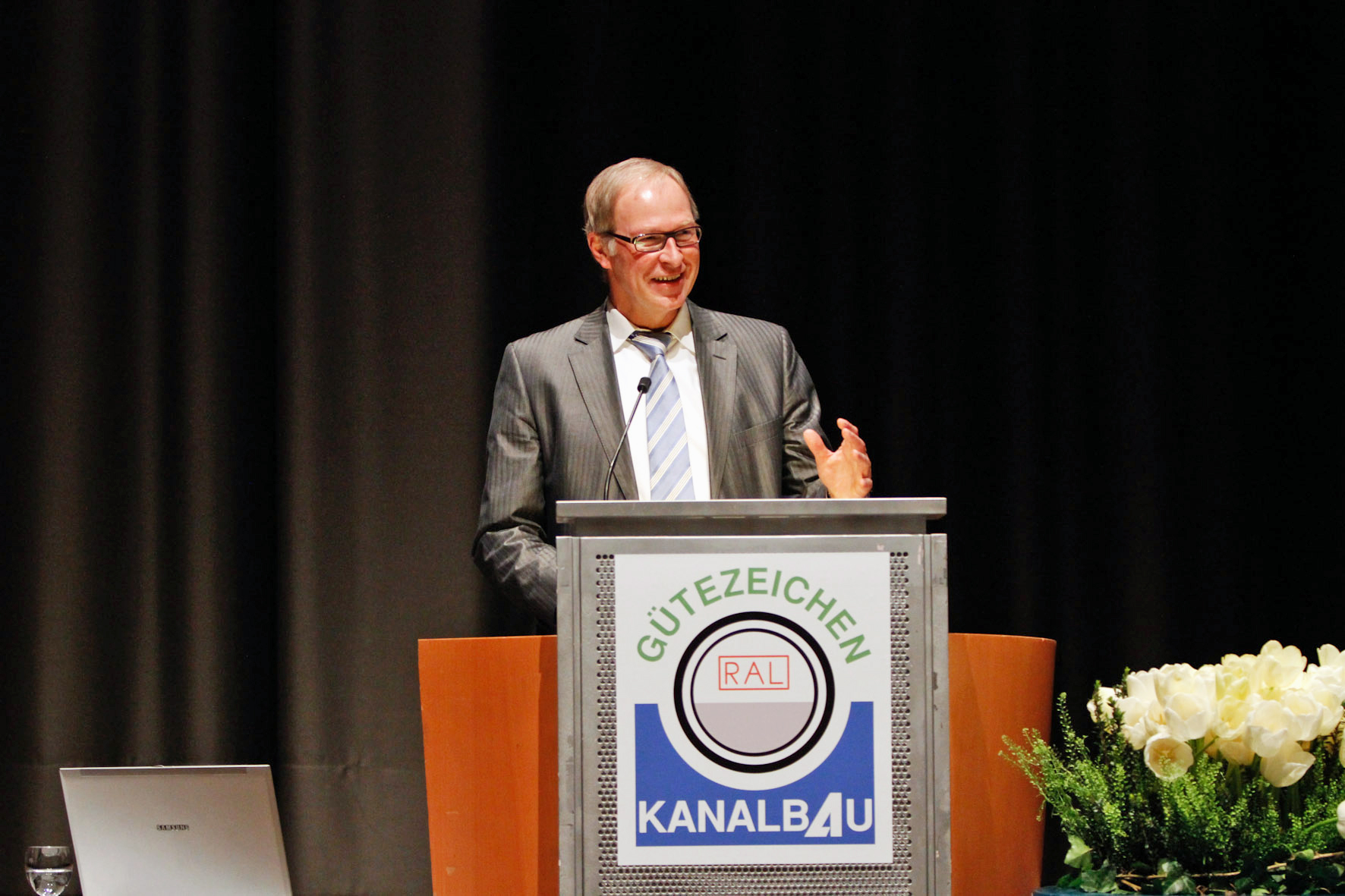 | Dipl.-Ing. Dieter Jacobi, Leiter Einkauf der Berliner Wasserbetriebe und stellv. Vorstandsvorsitzender der Gütegemeinschaft Kanalbau, hob in seiner Rede den Konsens zwischen Auftraggebern und Auftragnehmern in Bezug auf die Gütesicherung hervor. |